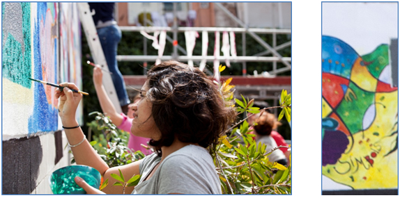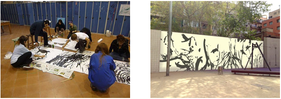 Pati Escolar Obert al Barri de l’Escola Carlit: aquest projecte va permetre implicar en el projecte des del primer moment els alumnes de segon cicle d’educació primària, alumnes dels cursos de cinquè i sisè. Prenent com a centre d’interès les llengües del món, en el marc de la Setmana Cultural de l’escola, són els mateixos alumnes de l’escola Carlit, en col·laboració amb l’escola Massana, els que concreten què és el que volen reflectir al mur. Mitjançant una dinàmica de grup, els alumnes de segon cicle de primària escullen una paraula, un idioma i un país, que després els alumnes del Cicle Formatiu d’Arts Aplicades al Mur acaben traduint en una imatge gràfica que es transporta al mural.