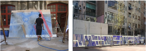 Jardins de Cèsar Martinell: la tècnica triada és la del mural ceràmic i en aquests moments estan treballant a les aules de l’Escola Massana pintant les rajoles que han de formar part del mural. Un cop enllestit aquest procés, es treballarà en l’espai per tal que els alumnes puguin instal·lar les rajoles. El projecte s’ha treballat en una primera fase a l’assignatura de dibuix artístic i, en una segona fase, al taller de pintura ornamental aplicada al mur. És un recobriment de ceràmica en la paret del carrer Villarroel d’uns 73 m2 (33 m de llargada per 2,20 d’alçada). El cobriment serà a base d’unes 1.900 rajoles ceràmiques de 20×20 cm o 14×28 cm amb la tècnica d’engalbe. El tema a treballar és el de la mirada interior dels balcons i finestres dels interiors dels patis de l’Eixample, inspirant-se gràficament en el gest i traç dels dibuixos de Xavier Nogués.