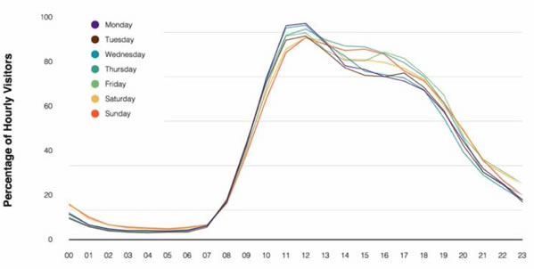 Les hores de major afluència són entre les 10.00h i les 12.00 hores, amb un patró molt similar per al conjunt de dies entre setmana. Els divendres, en canvi, s’assimilen més al dissabte i diumenge, dies en què creix el nombre de visites durant la tarda.