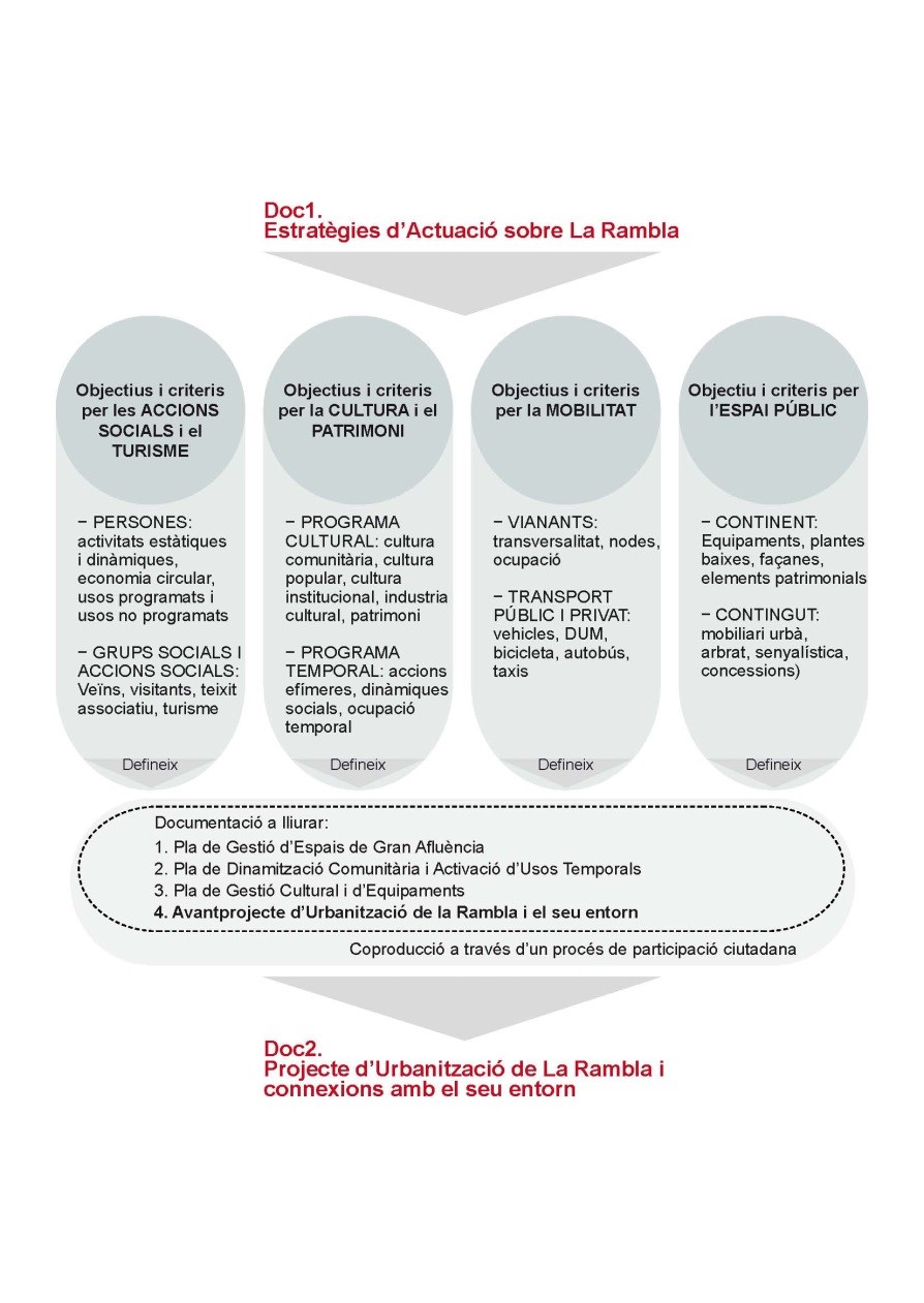 Així, es contempla que l’equip redactor que resulti guanyador haurà de presentar dos documents. D’una banda, les estratègies d’actuació que han de tenir en compte la definició d’objectius i criteris per a les accions socials i el turisme; la definició d’objectius i criteris per la cultura i el patrimoni; la definició d’objectius i criteris per a la mobilitat; i la definició d’objectius i criteris per a l’espai públic. I, de l’altra, el projecte d’urbanització, condicionat per l’anterior document. Recuperar la Rambla requereix anar més enllà d’un projecte d’urbanització.