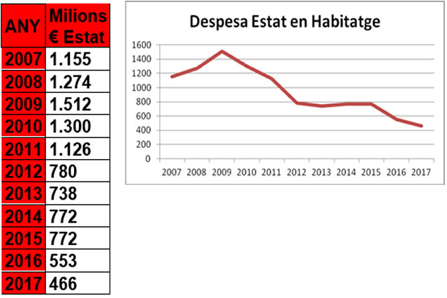 La desprotecció legal que pateixen els ajuntaments coincideix amb una important davallada pressupostària per part de l’Estat. El govern espanyol destina actualment un 0,058% del PIB espanyol a habitatge, front el 1,8% de França, és a dir, vint cops menys. Així, la principal eina de finançament de les polítiques d’habitatge a Catalunya, el Plan Estatal de Vivienda, s’ha reduït en més del 70% durant els darrers anys, ha passat de 1.155M€ l’any 2016 a 466M€ l’any 2017.