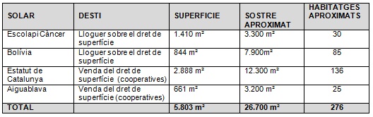 Així doncs, dos dels solars que han sortit a concurs públic es destinen a la promoció d’habitatge de cooperatives en règim de venda del dret de superfície. Es tracta d’una novetat pel que fa al mecanisme d’adjudicació de solars a aquest tipus d’entitats –per concurs-, i també una innovació en la fórmula de cessió d’aquests solars –la venda de dret de superfície.