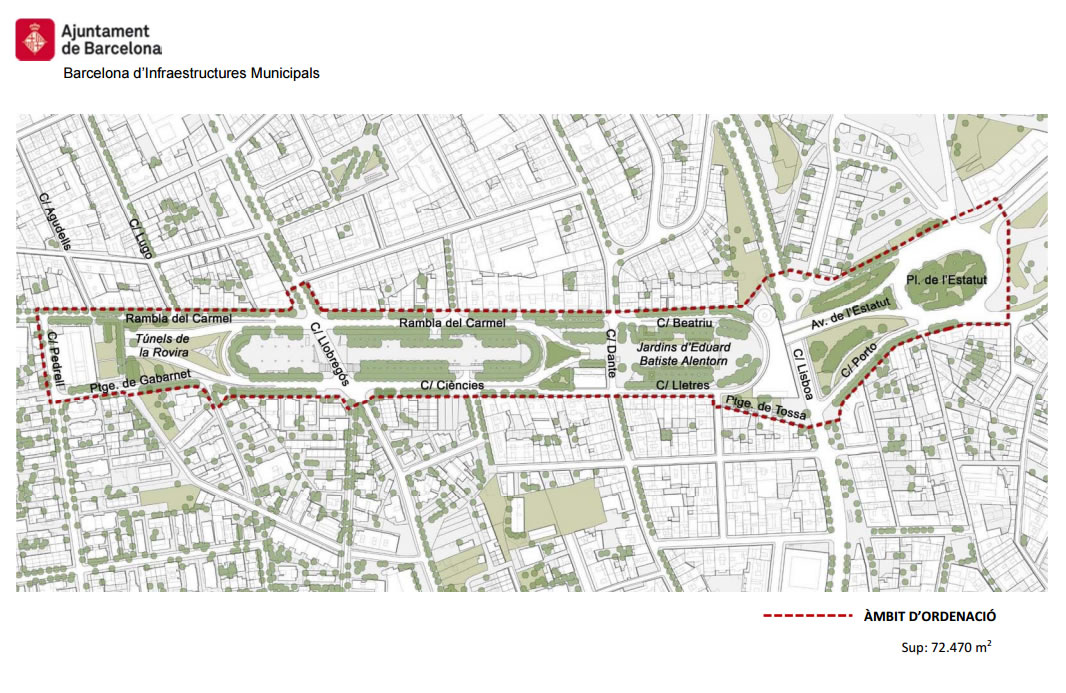 Per iniciar aquesta remodelació, l’Ajuntament de Barcelona impulsa aquest concurs de projectes sobre l’àmbit de la Rambla del Carmel que comprèn una superfície aproximada de 72.470m2. L’espai queda al bell mig dels barris del Carmel, la Font d’en Fargues i Horta, i delimitat pels carrers Beatriu, Rambla del Carmel, carrer Pedrell, ptge. Gabarnet, carrer de les Ciències, carrer de les Lletres, ptge. Tossa, carrer Porto i Av. de l’Estatut.