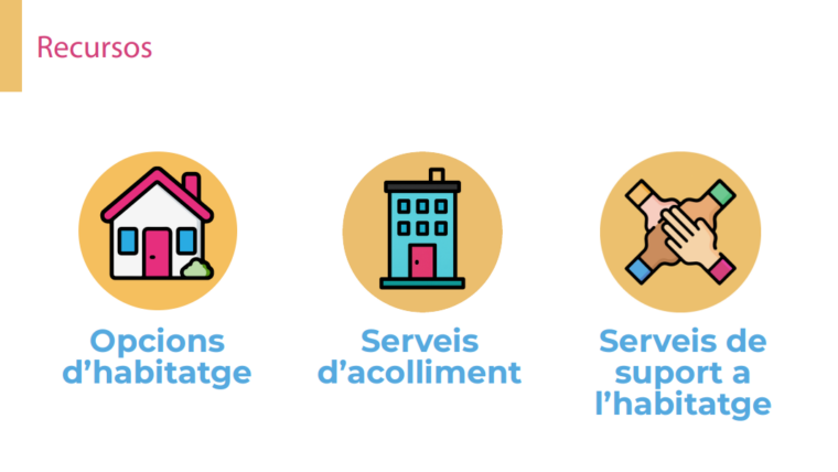 La guia explica les principals alternatives d’habitatge. Per exemple: els habitatges d’inclusió, l’habitatge cooperatiu, les opcions amb protecció oficial i el mercat privat. També explica els serveis d’acolliment residencial i els serveis de suport a l’habitatge per a la vida diària a la llar i a la comunitat.
