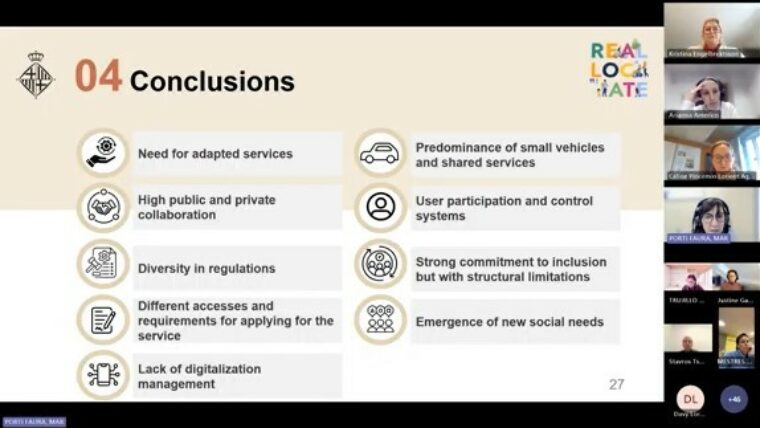 El encuentro reunió 60 participantes de 15 ciudades, el 65% de los cuales provenían de la administración pública. El IMPD presentó los resultados del análisis comparativo de los servicios de transporte especial para personas con discapacidad en el ámbito europeo. El informe, se elaboró a partir de un cuestionario enviado además de 50 ciudades, en el que se recogen datos de 15 ciudades de 8 países y se examina siete áreas clave: el contexto del servicio, los procesos de solicitud y provisión, los aspectos positivos y negativos, las necesidades emergentes y otras consideraciones relevantes.