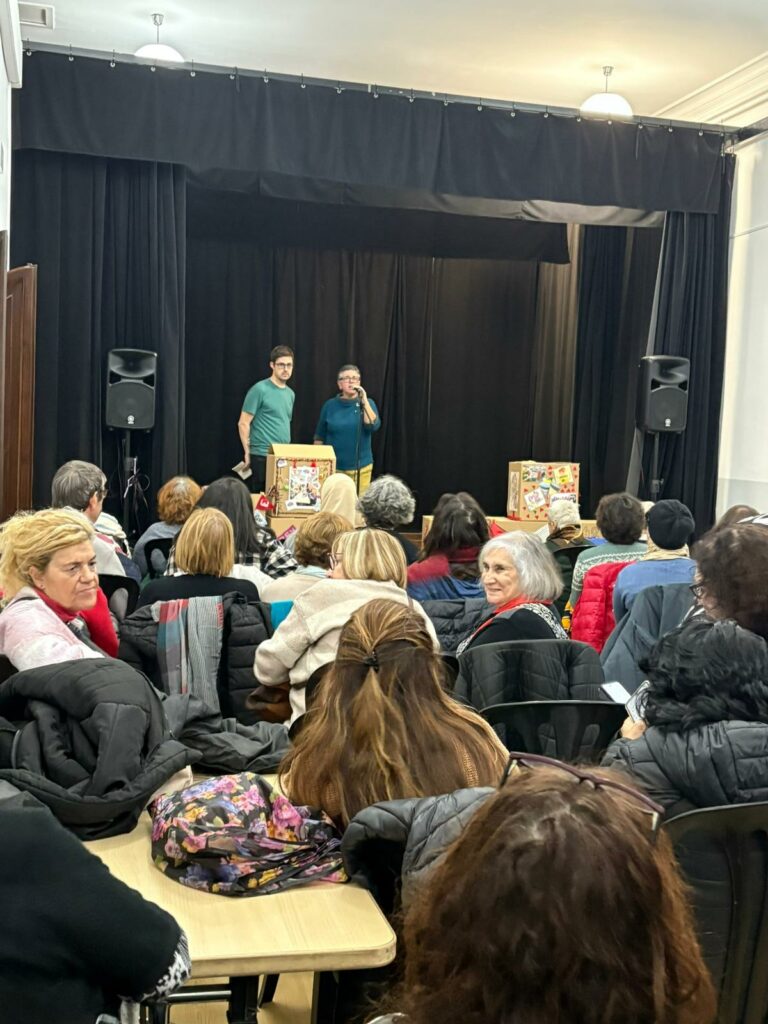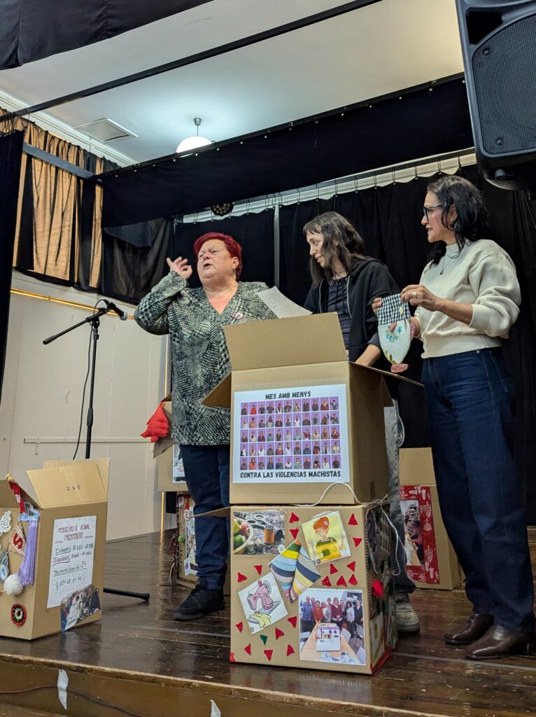 En una primera part de l’activitat, els grups es van anar presentant a través d’una dinàmica participativa preparada prèviament. A partir de les seves peces tèxtils, van explicar qui són, què les motiva i quines activitats duen a terme habitualment, generant un primer espai de coneixement mutu i la creació de nous vincles de relació