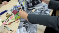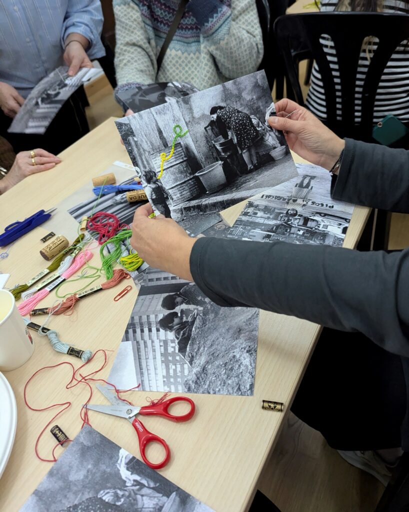 Tot seguit, es va dur a terme un tastet de fotobrodat, conduït per l’Eva Tolosana, veïna de Torre Baró, a partir de fotografies dels moviments veïnals dels anys setanta i vuitanta de la vida col·lectiva a Nou Barris. L’activitat va permetre apropar-se a aquesta tècnica de la mà de l’expertesa de l’Eva i va donar lloc a moments especialment emotius, en reconèixer persones conegudes i referents veïnals a les imatges.