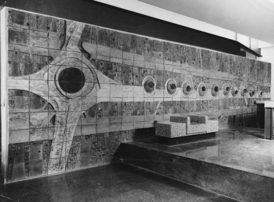 Fora de Barcelona, hi havia un mural titulat l’Esforç, a la Caixa del Crèdit per l’Habitatge, a Lleida. L’entitat va passar a ser la Caixa dels Pirineus i després s’ho va quedar la Caixa. Quan vaig anar a fer-ne una foto, el mural havia desaparegut. El director de l’agència em va dir que quan van agafar el local, el mural ja no hi era. En canvi el mural anomenat La porta… i al darrera què? sí que existeix perquè el vaig donar al Museu d’Art Contemporani Vicente Aguilera Cerni que es troba a Vilafamés. També vaig fer passadors de porta per l’edifici nou de l’Aliança, també han desaparegut. Sort que me’n queda un que vaig fer de més. I n’hi havia un a Tortosa, anomenat Mediterrània, un mural que va guanyar la medalla d’or al concurs de Faenza, a Itàlia, el 1973. La Caixa me’l va comprar per a una oficina i ara m’han dit que no hi és. És increïble.