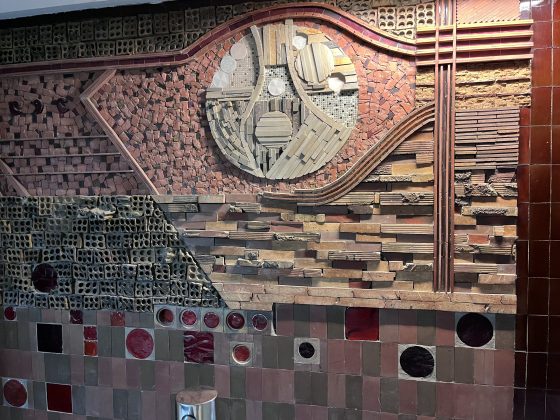 Descripció: revestiment de paret del vestíbul d’entrada de l’edifici, situat a l’exterior. El mosaic està realitzat amb rajoles de ceràmica esmaltada de forma quadrangular i rectangular amb relleu i llises. La decoració representa anells vermells amb un punt interior disposats sobre un fons marró amb relleu. Alternen petits plafons de peces llises de ceràmica de color marró. Trobem un revestiment similar al carrer de Pons i Subirà, 3 i al carrer de Gósol, 14.