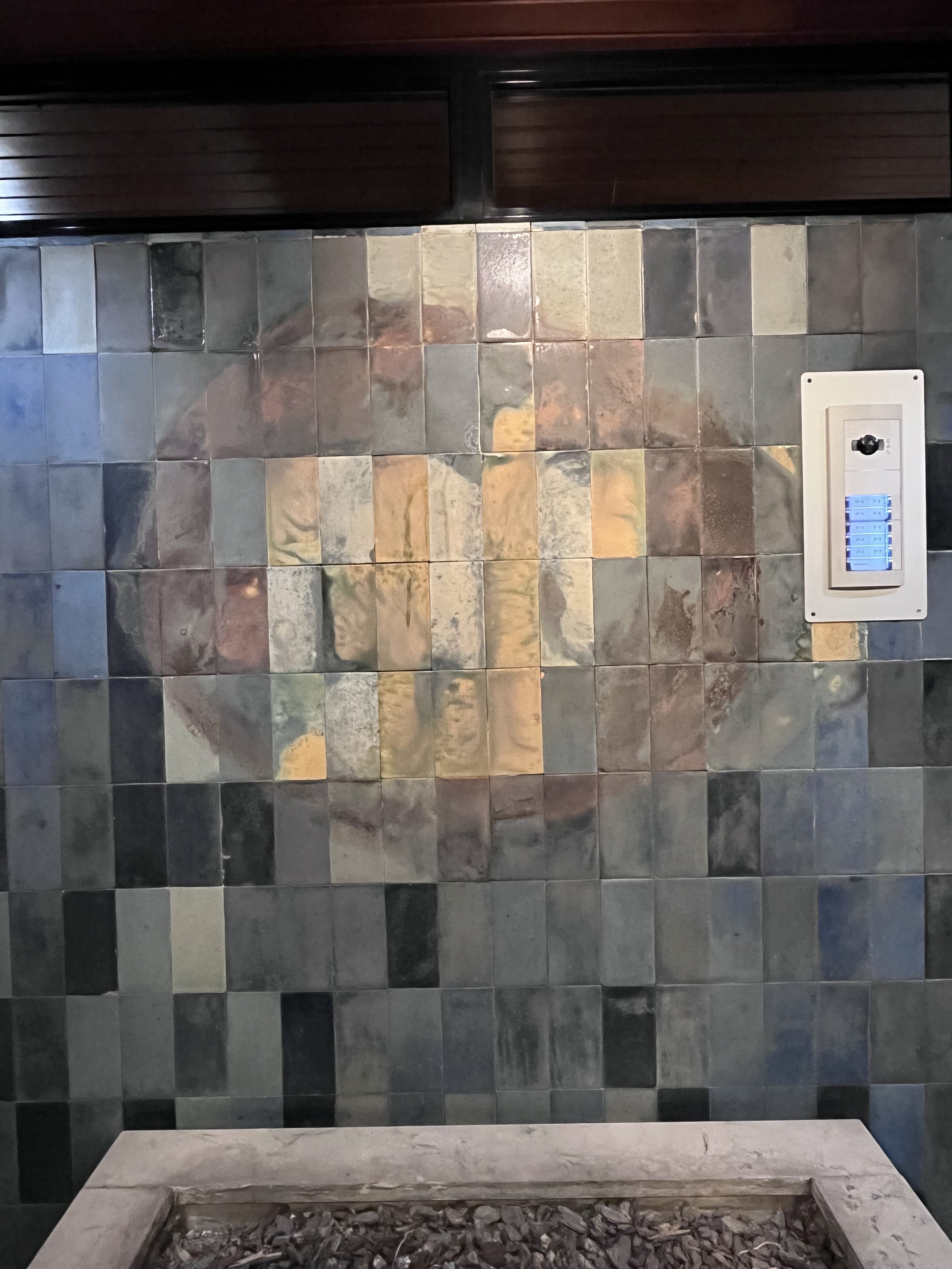 Descripció: plafó situat al costat de la porta d’entrada de l’edifici Luxemburgo, a l’exterior, dins el conjunt residencial Bonanova Park. El mosaic està realitzat amb rajoles de ceràmica esmaltada de forma rectangular. La composició representa un disc de tons càlids sobre un fons de tons freds.