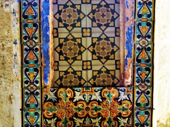 - Plaça de la Concòrdia, 14-15. Paviment amb quadrat negre i volutes grogues