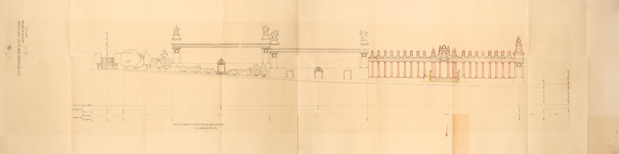 Vista de l’avinguda dels Oficis (avui Pl. Puig i Cadafalch) amb la columnata que tanca la plaça de les Belles Arts i la façana d’un dels Palaus de l’Art Modern (avui Palau de Victòria Eugènia). AMCB. Fons Institucional, Exposició Internacional de 1929: DGC.10 Obres i serveis, R.4724 de 15 d’octubre de 1917. Josep Puig i Cadafalch.