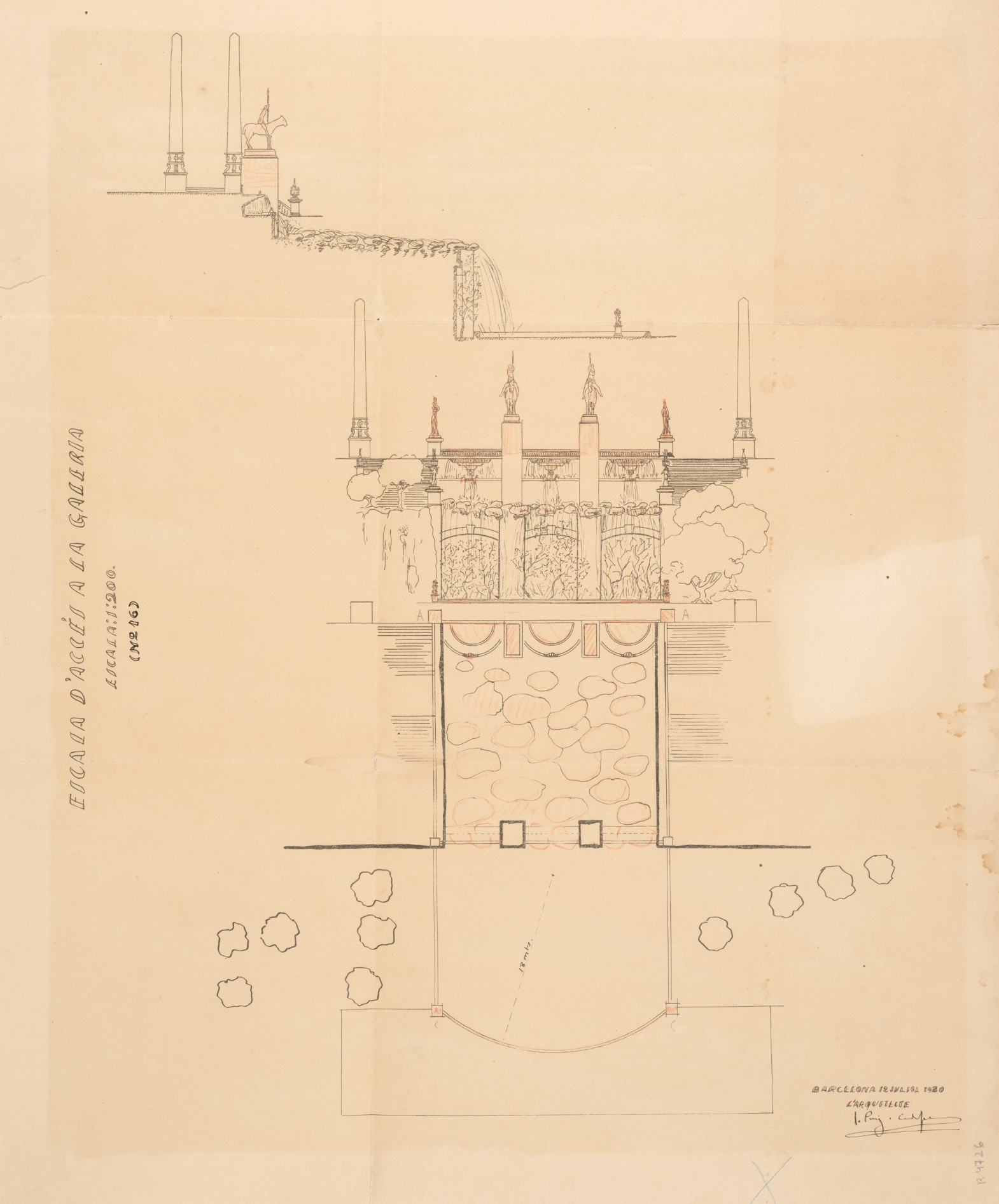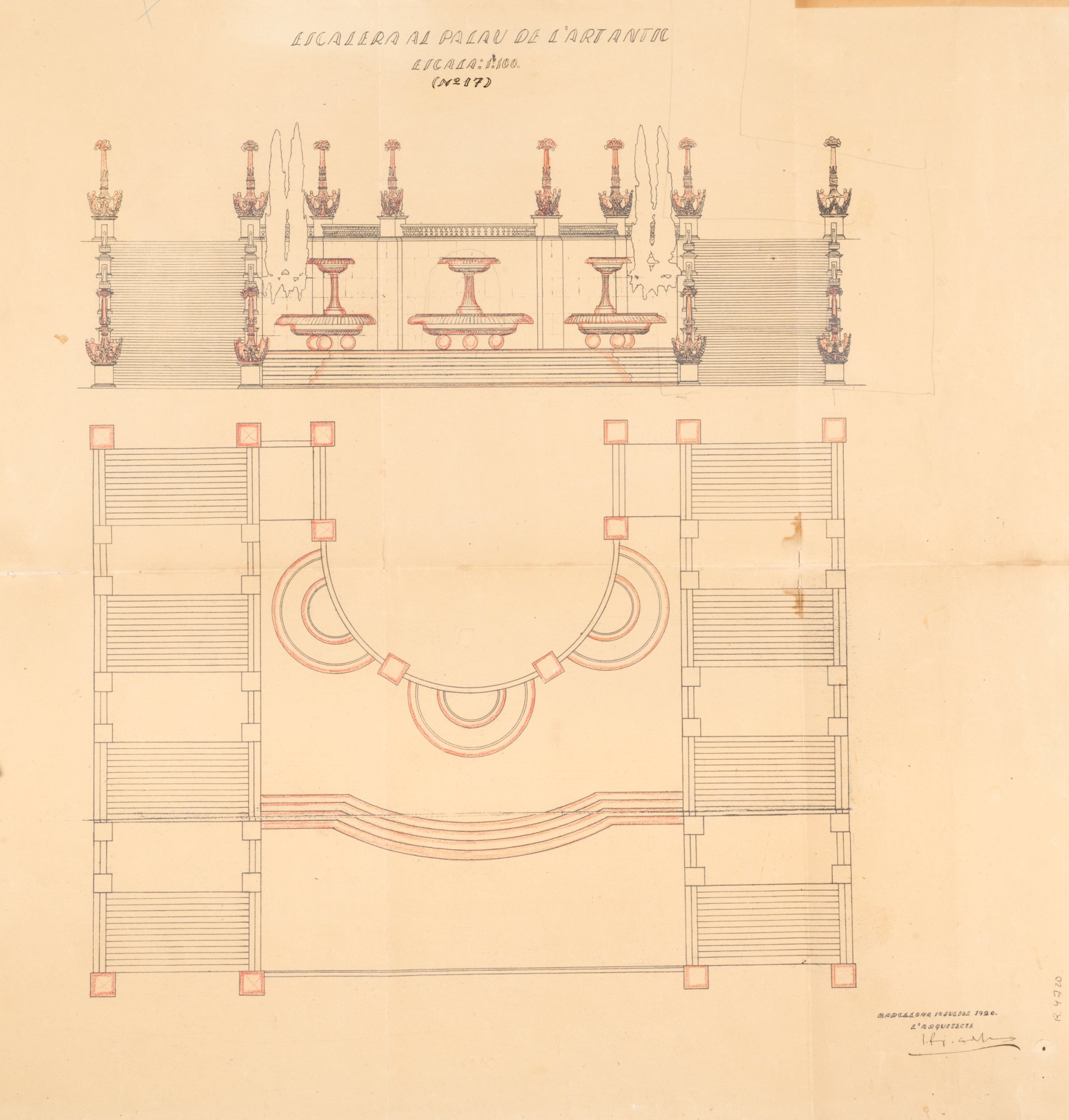Projecte d’escalinata d’accés a la «galeria» (entre l’actual passeig a Jean Forestier i l’esplanada davant l’actual Palau Nacional). AMCB. Fons Institucional, Exposició Internacional de 1929: DGC.10 Obres i serveis, R.4726 de 12 de juliol de 1920. Josep Puig i Cadafalch.