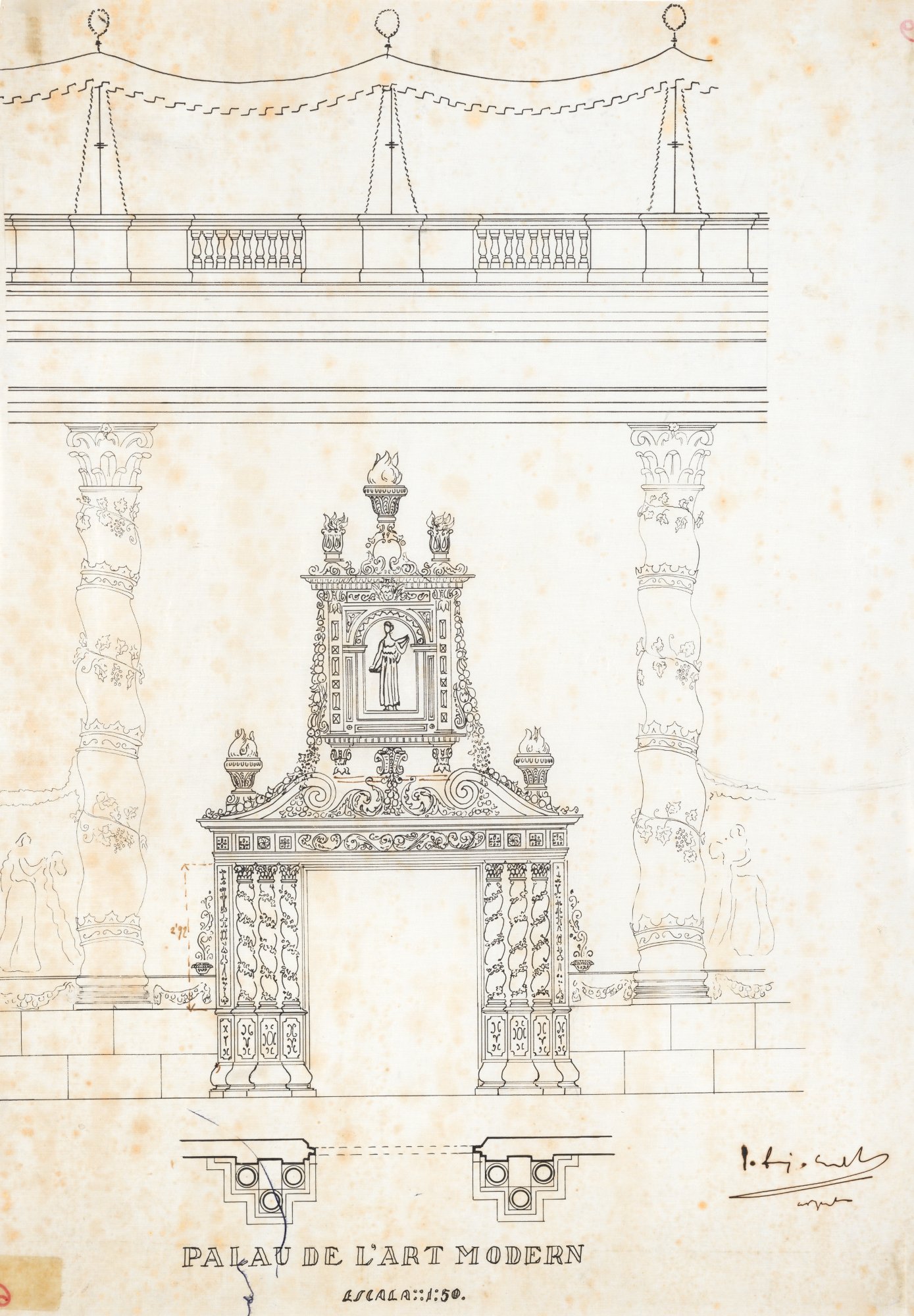 Projecte dels cossos avançats de la plaça de les Belles Arts (avui pl. de Carles Buïgas), amb les quatre columnes que representen les Quatre Barres. AMCB. Fons Institucional, Exposició Internacional de 1929: DGC.10 Obres i serveis, R.4722 de 25 de març de 1920. Josep Puig i Cadafalch.