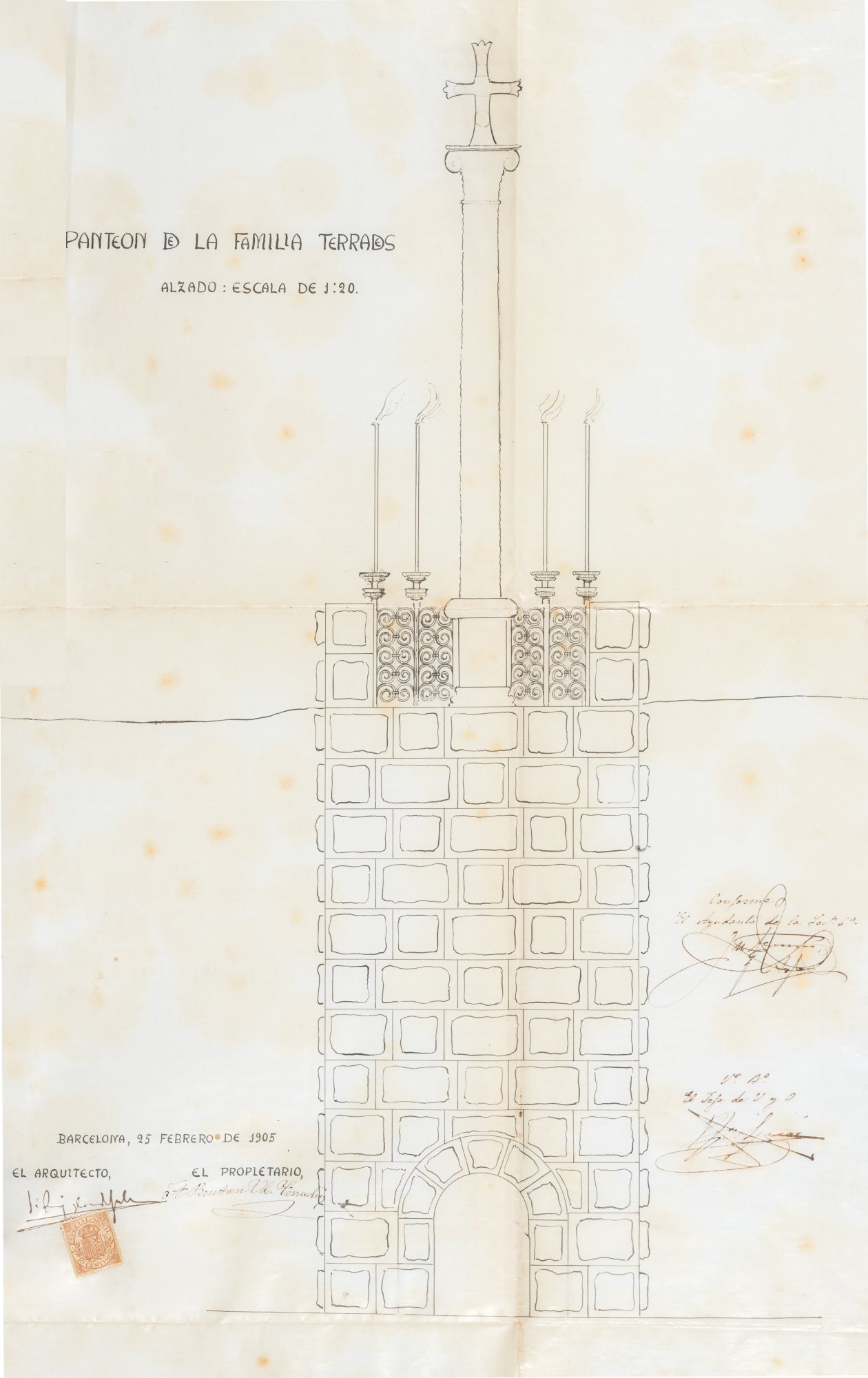 Com era habitual en l’època, les «residències» d’eternitat solien ser construïdes pel mateix arquitecte que havia projectat els habitatges, les cases d’estiueig o les fàbriques; en el cas de Puig i Cadafalch, rep encàrrecs dels Terradas i els Monserdà, a més dels Dam i Montells i els Valldaura.