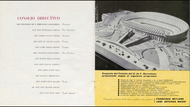 Una Finestra a l’Arxiu presenta el notable cartell de Joan Miró per a la commemoració del setanta-cinquè aniversari del Barça (les noces d’argent, el 1924, van comptar amb un cartell fantàstic de Josep Segrelles que apareix reproduït a l’Historialdel Club, mentre que els cartells de les noces d’or van ser de l’agència publicitària Crisol i el del centenari, del pintor Antoni Tàpies). La inauguració de l’estadi, el Camp Nou, durant les festes de la Mercè del 1957, va ser anunciada amb un cartell d’Amand Domènech, un dels pioners del disseny català. Complementen la mostra una butlleta electoral, per a l’últim mandat de Hans Gamper com a president de l’entitat; una publicació sobre la inauguració de l’estadi, el 1957; una entrada que segurament correspon a l’antic camp de les Corts i un carnet de soci de l’any 1968.
