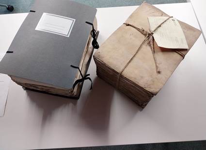 Grup de documents protegits per dues tapes de cartró i lligats amb una cinta que uneix i tanca el conjunt.