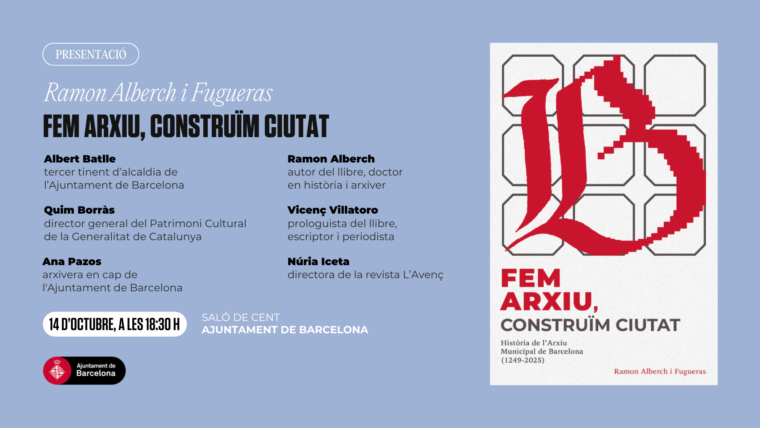 El día 14 de octubre, el Archivo Municipal de Barcelona y Barcelona Llibres presentan el libro 'Creamos Archivo, construimos ciudad. Historia del Archivo Municipal de Barcelona (1249-2025)', del autor Ramon Alberch i Fugueres, en el Saló de Cent del Ayuntamiento de Barcelona. Con motivo de la celebración del Congreso Internacional de Archivos - ICA Barcelona 2025, se quiere dar a conocer este estudio sobre la evolución del Archivo como depositario de la memoria colectiva e instrumento de transparencia en la gestión de los asuntos públicos.