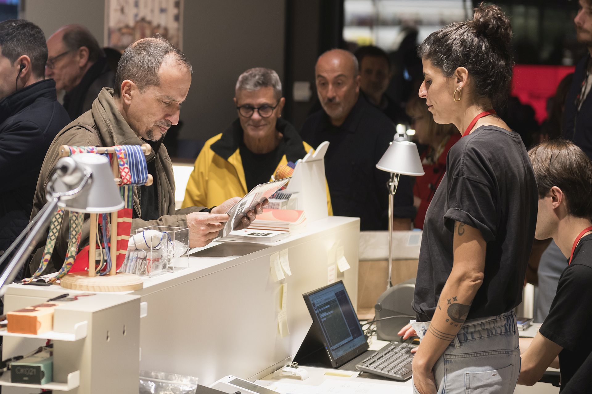 Dempeus, Albert Díaz, cap de la Biblioteca i Arxiu del Disseny. A la taula, d'esquerra a dreta: Juli Capella (arquitecte), Miquel Izquierdo, autor dels textos, Gonzalo Milá i Claudia Oliva, comissaris de l'exposició i editors de la publicació, i César Martínez-Useros, director de La Fábrica.