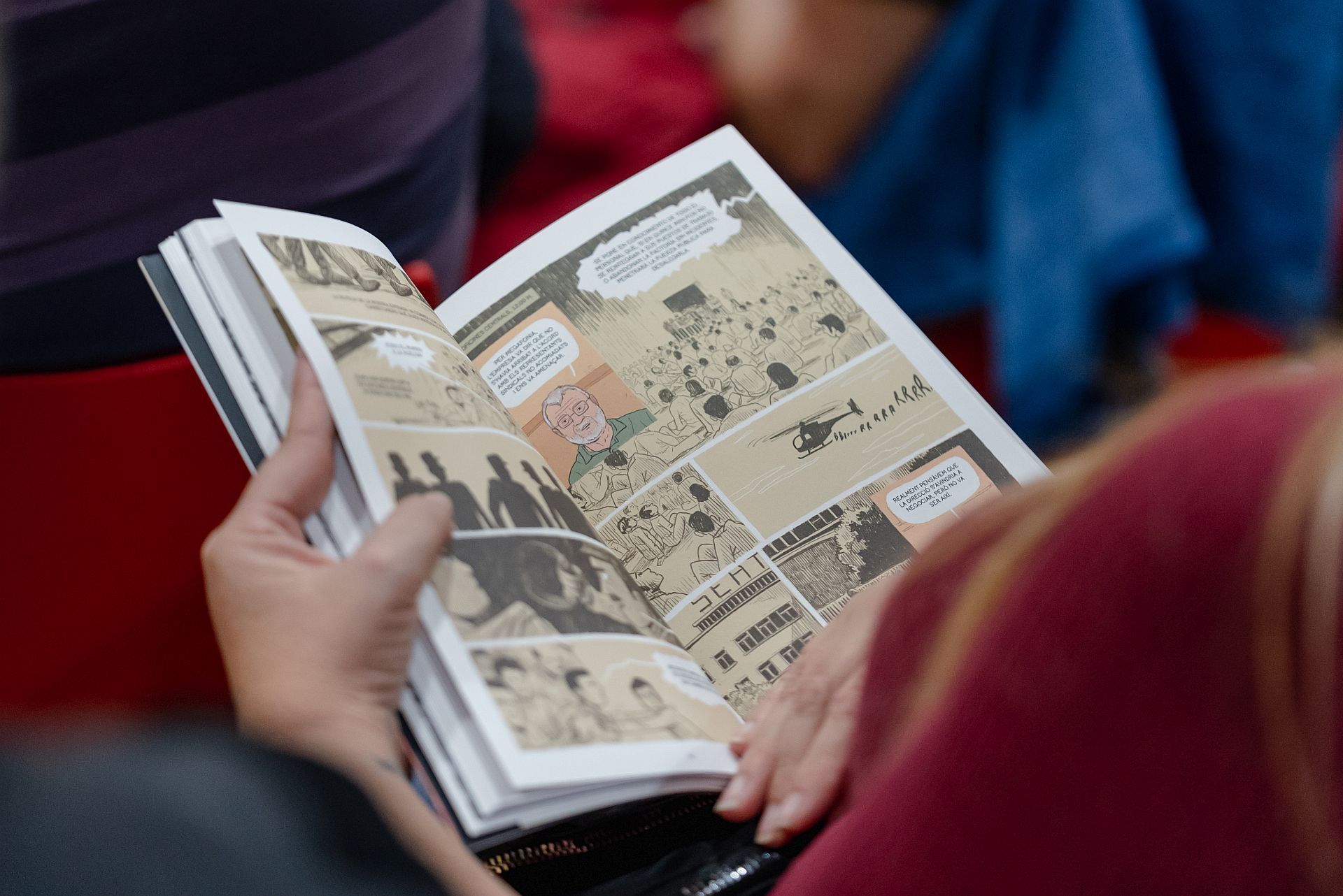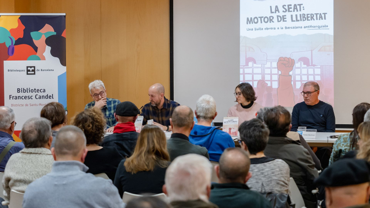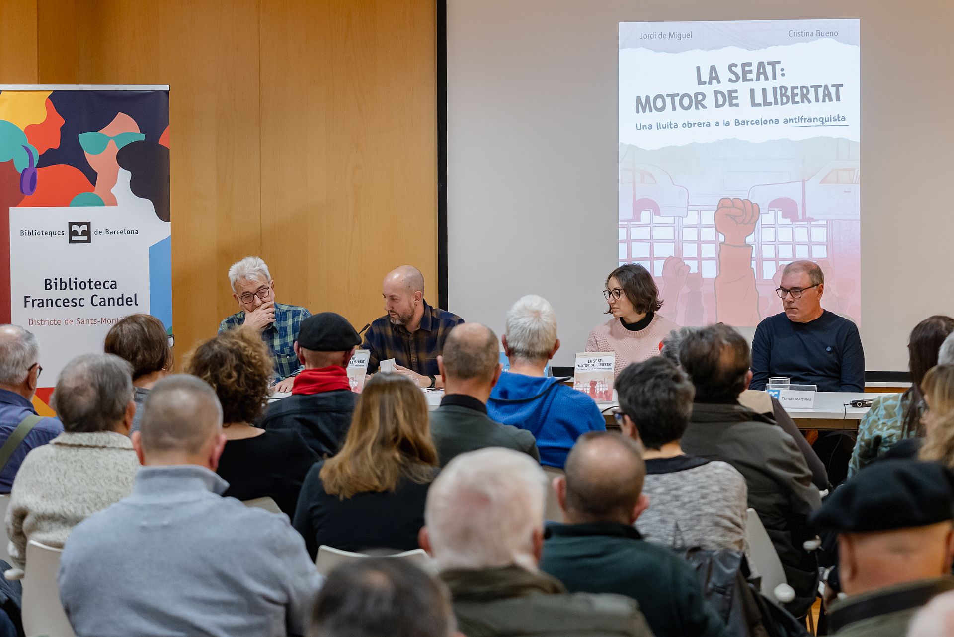 Els autors del llibre, Jordi de Miguel i Cristina Bueno, acompanyats per dos extreballadors de la Seat.