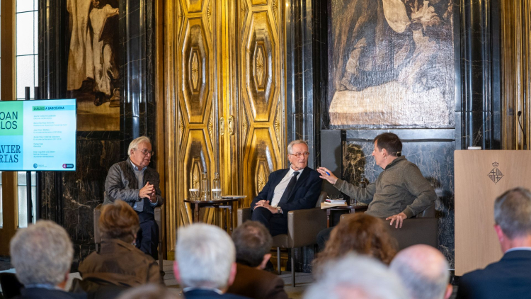 D’esquerra a dreta: Joan Clos i Xavier Trias, exalcaldes de Barcelona, i Carles Clos, periodista. Presentació Diàlegs a Barcelona: Joan Clos i Xavier Trias.