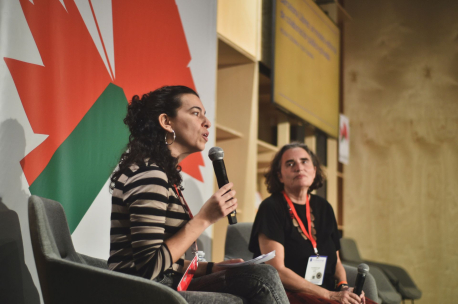 La periodista Montse Virgili entrevista a las autoras: Ana Montserrat y Marta Barceló. Al frente, a la derecha, Raquel Gil Eiroá, concejala de Feminismo, Igualdad y Memoria Democrática.