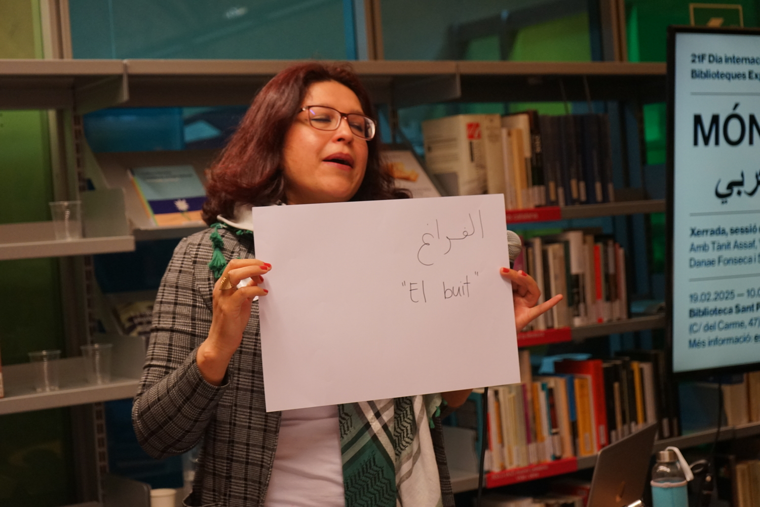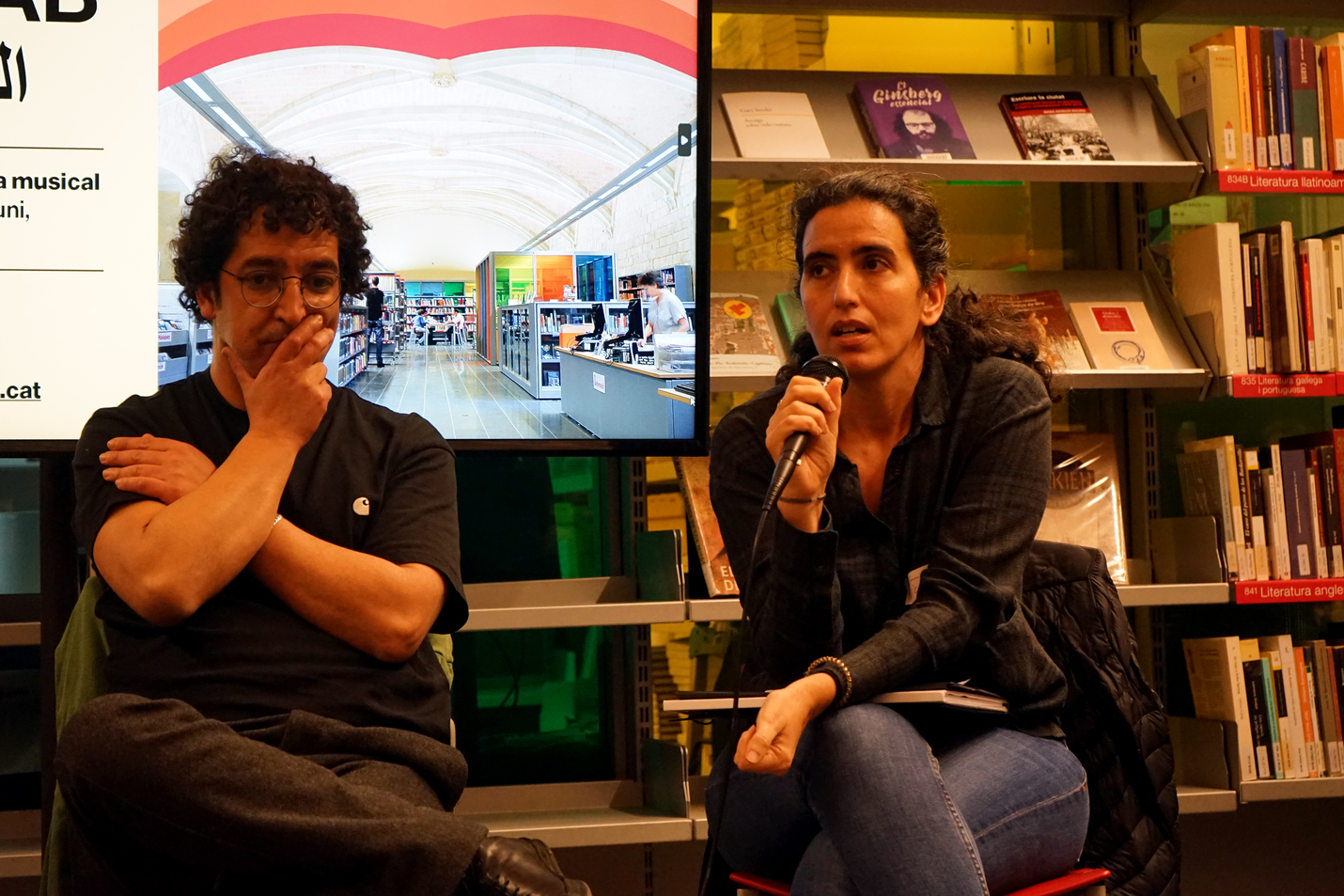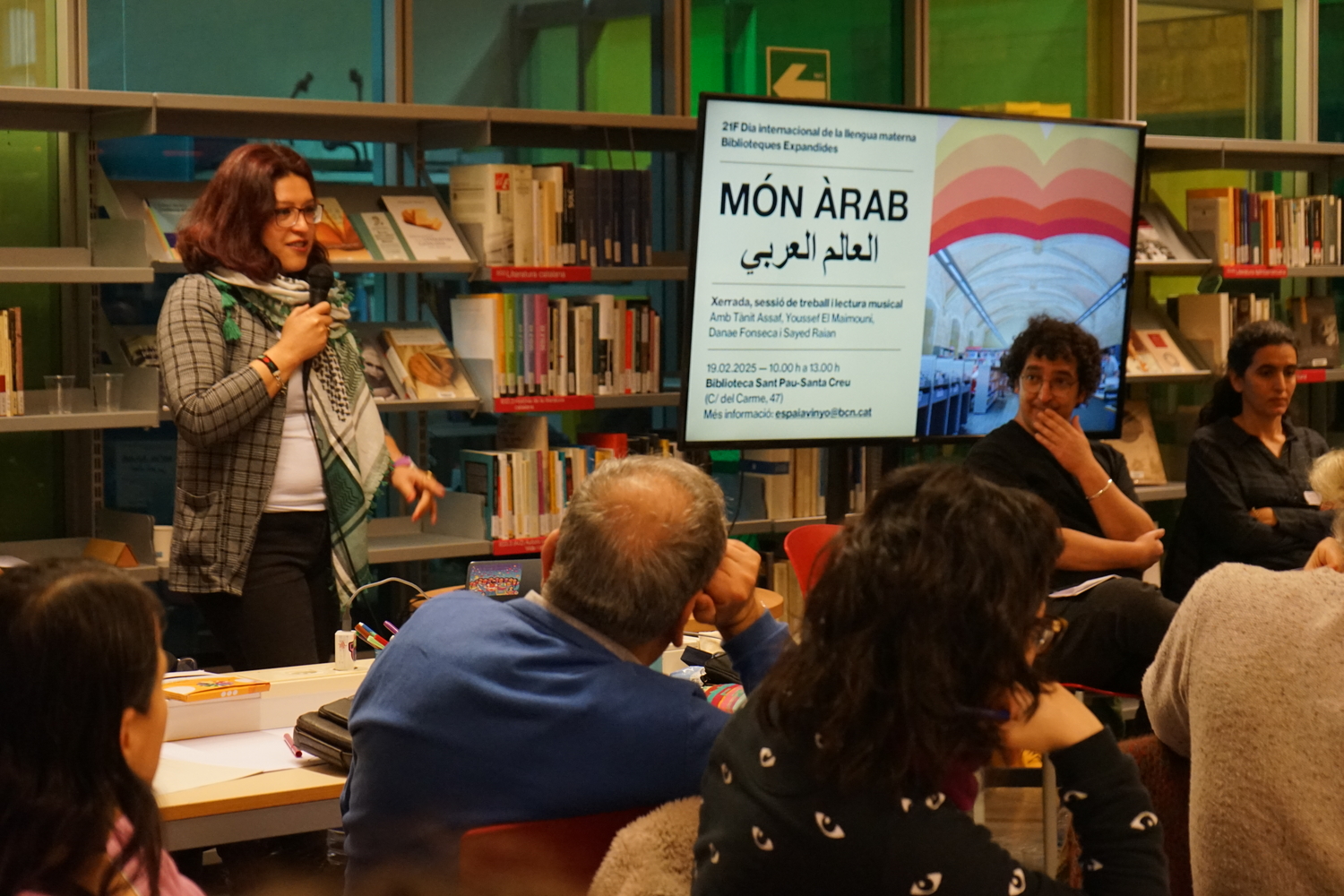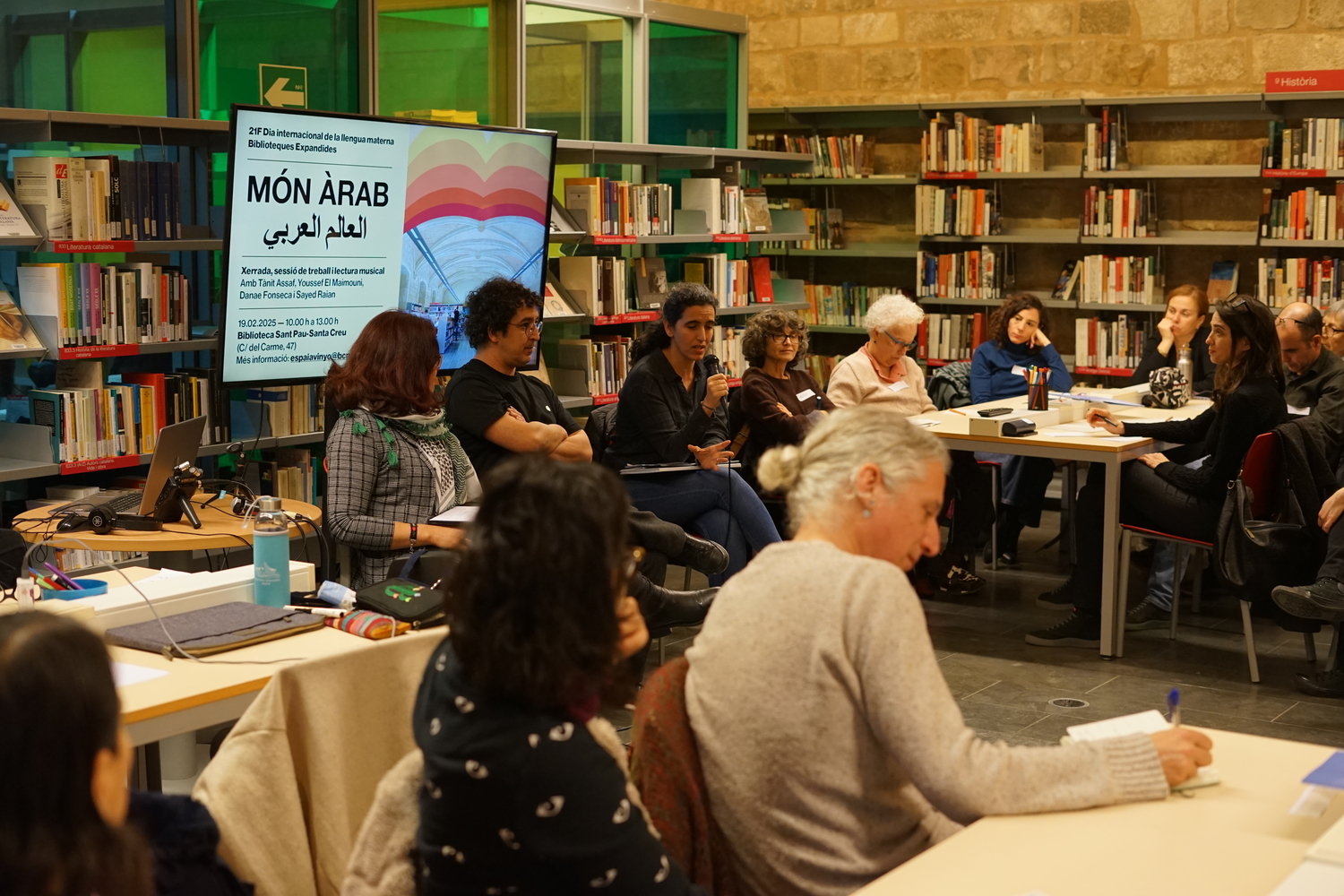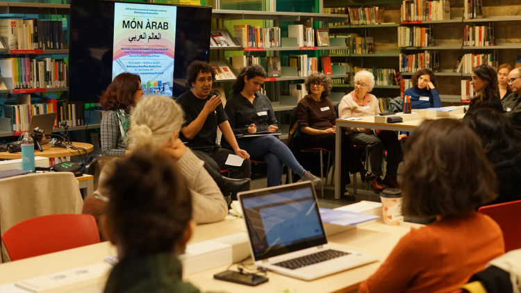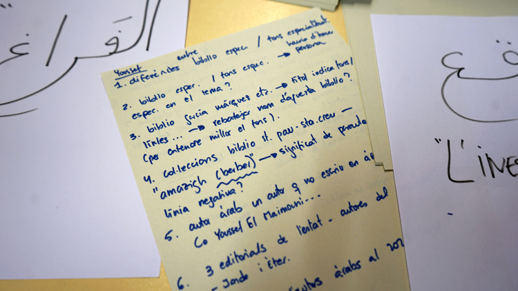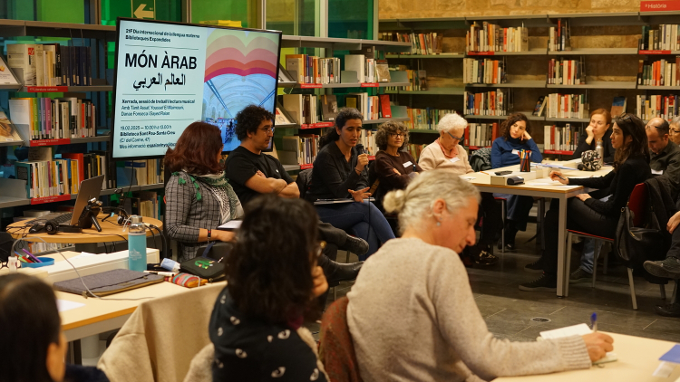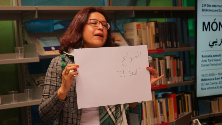 A continuació, la Tànit va proposar una reflexió sobre la presència de la llengua àrab a la ciutat. Seguidament, la Danae va introduir un marc per dialogar sobre l’origen colonial de les classificacions bibliogràfiques, abans de finalitzar amb una breu presentació de la classificació del fons per part de la biblioteca, actualment anomenat "Móns àrabs", entre altres categories com Cultura Amazigh o Diversitat cultural.