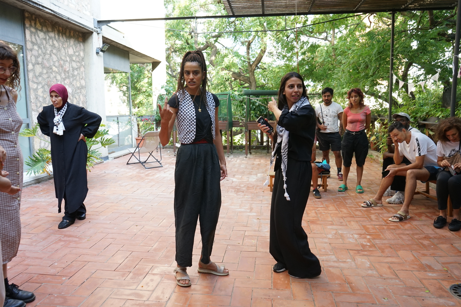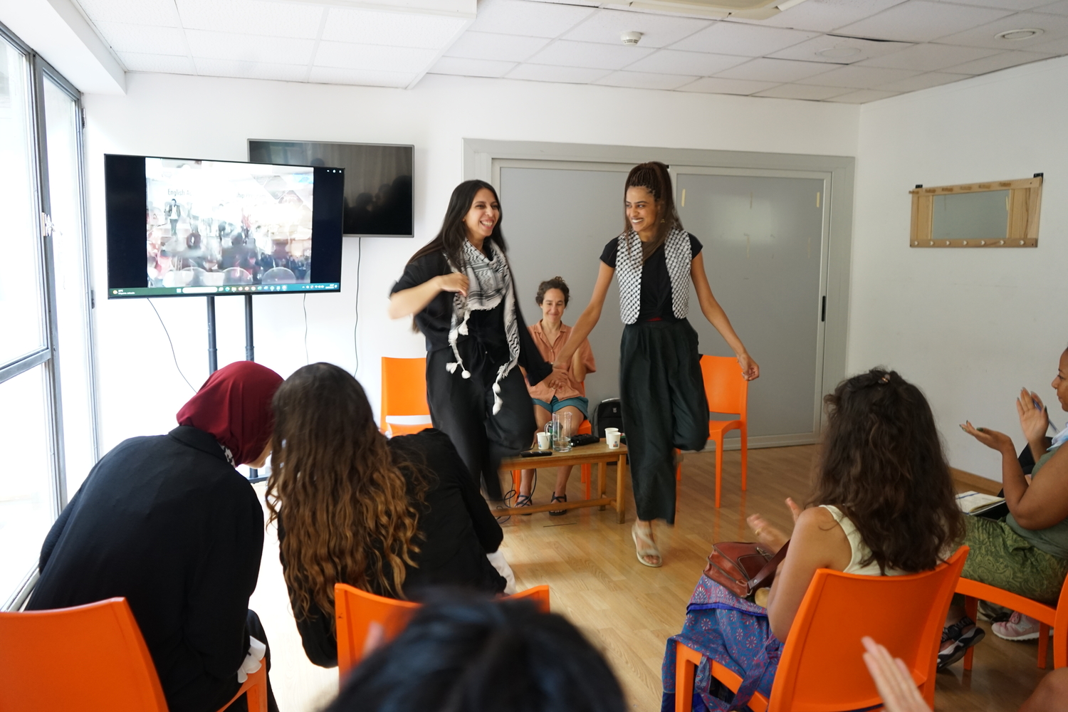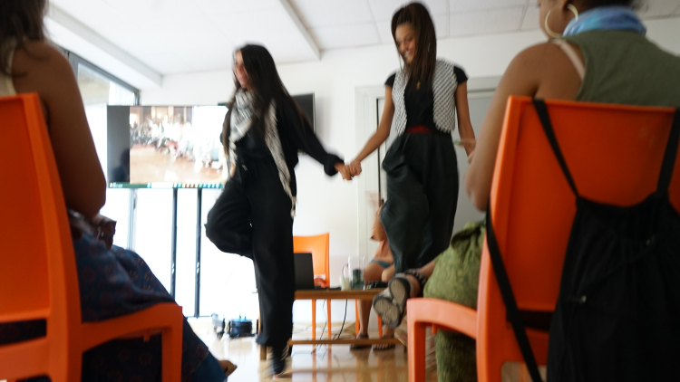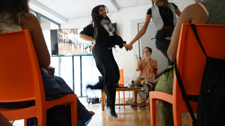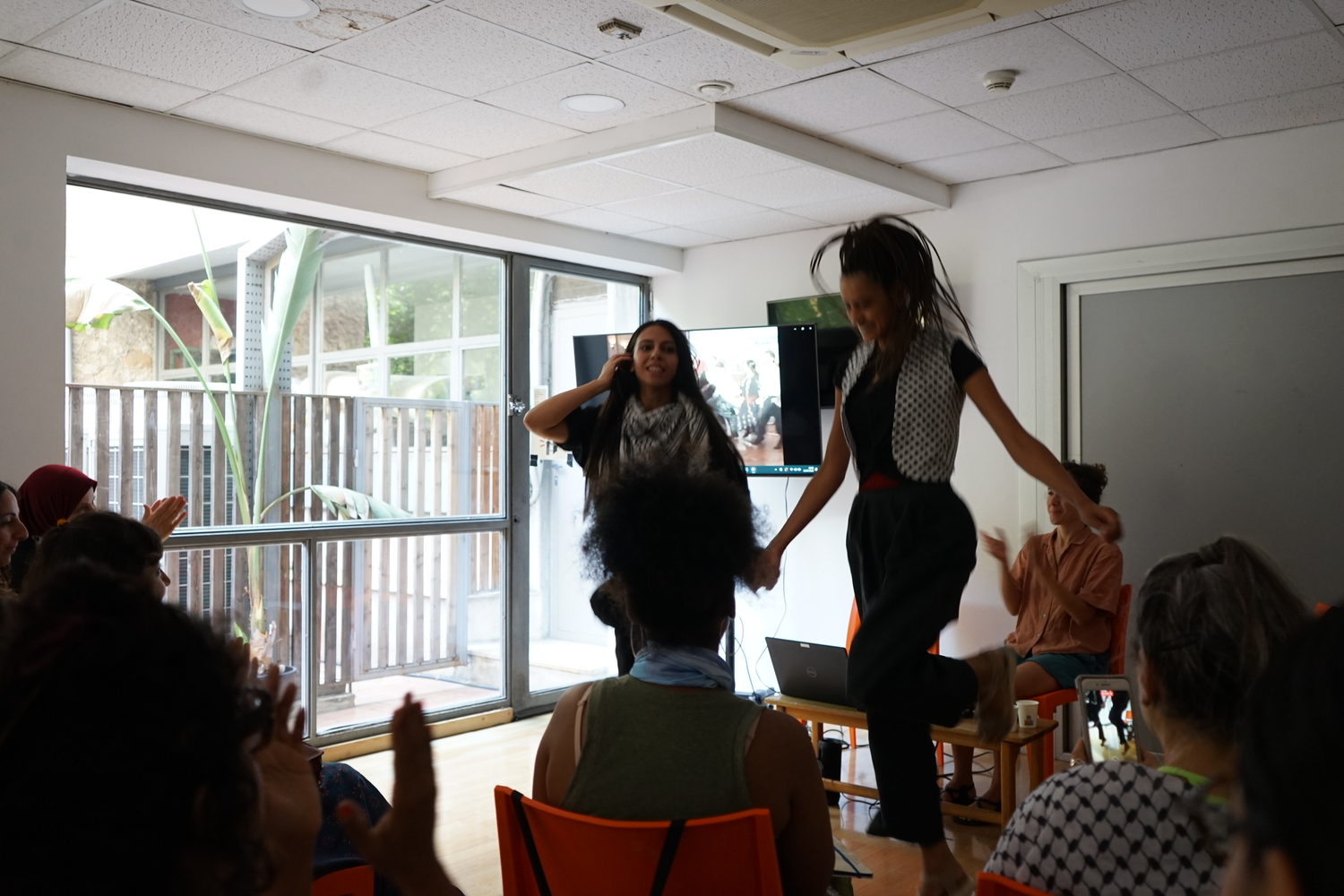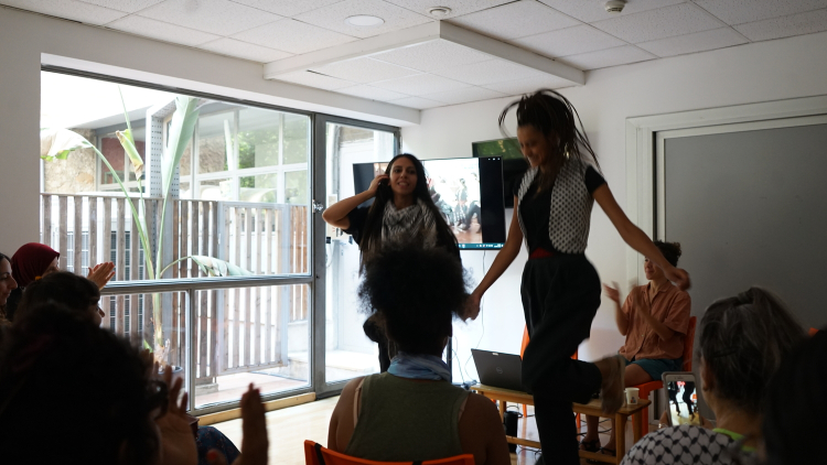 Per la seva banda, Shahd Abusalama ens va relatar en primera persona el setge que pateix la seva família a Gaza i ens va mostrar el curtmetratge del cineasta britànic-palestí Musheir El-Farra, And Still They Dance, rodat durant la Segona Intifada, on moltes persones, entre elles la seva àvia, parlen del dabke davant la continuïtat colonial de l’ocupació i del genocidi. Finalment, totes dues ens van convidar a practicar els passos principals del dabke, connectant amb les lluites del poble palestí i posant en valor les arts corporals com a formes de resistència i transmissió cultural.