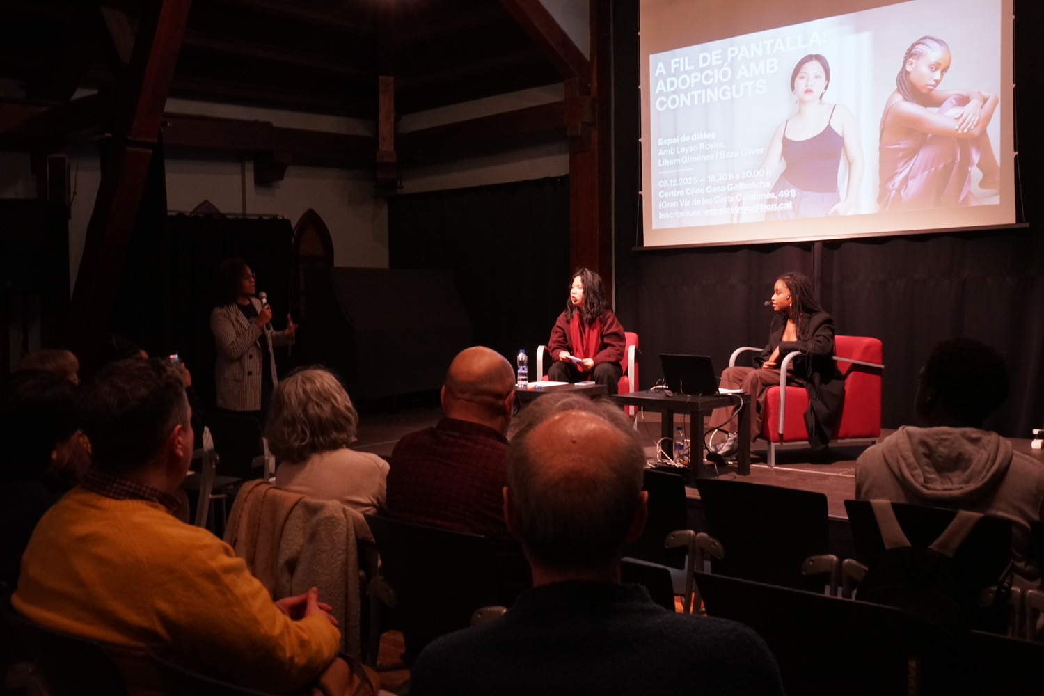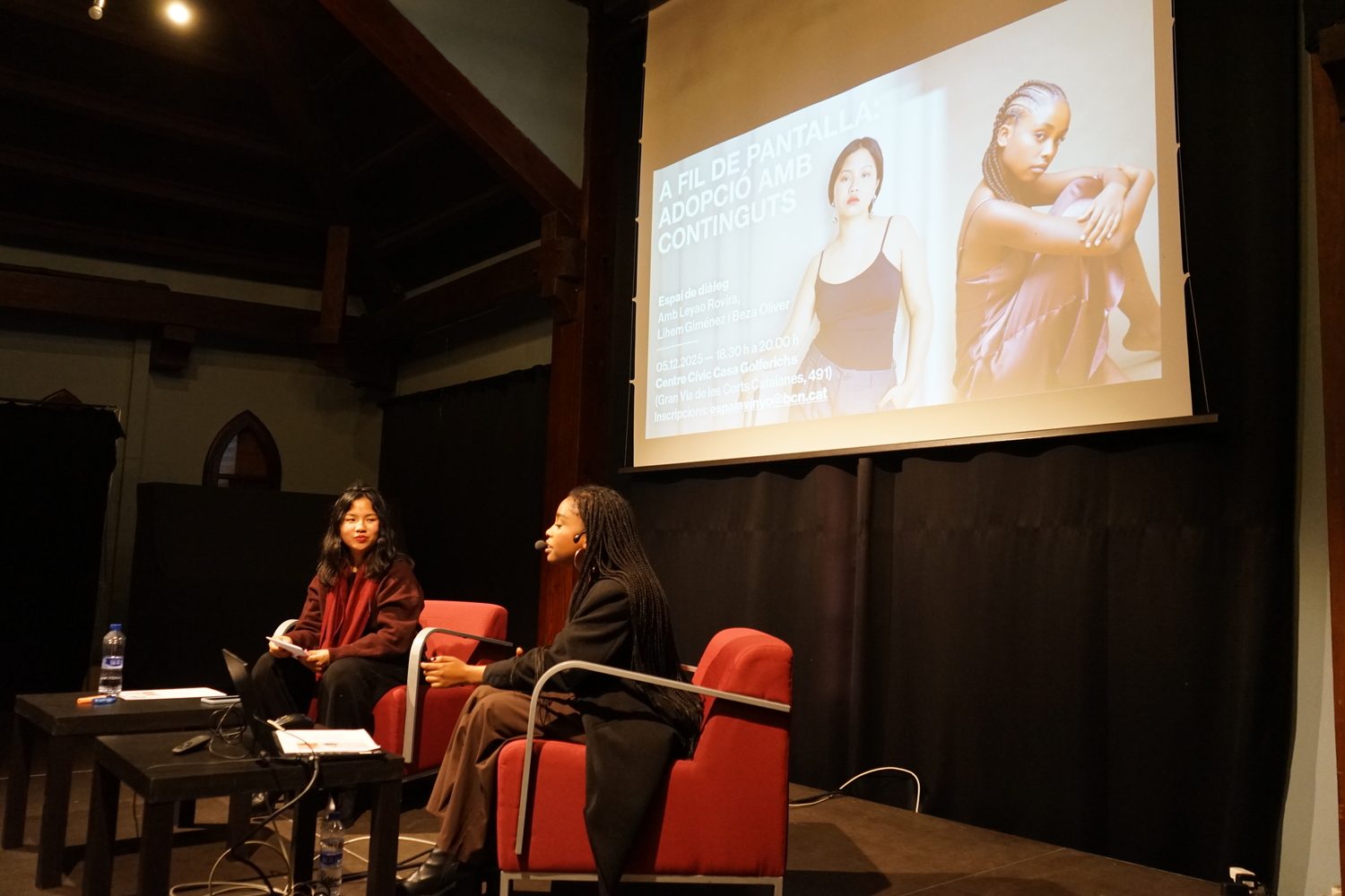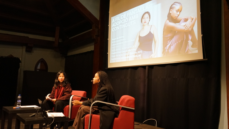 La conversa, iniciada a partir de les preguntes plantejades per Laia Muñoz, va obrir una reflexió crítica sobre els debats que emergeixen en la creació de continguts sobre adopció, les seves possibilitats per trencar estigmes i repensar el model d’adopció, així com les estratègies per generar espais segurs d’acompanyament entre joves adoptades. Les ponents van abordar el racisme estructural i quotidià a través de la mostra de petites càpsules de vídeo, en les quals es ressaltaven respostes davant la soledat i es trencaven silencis que travessen moltes persones adoptades no blanques.