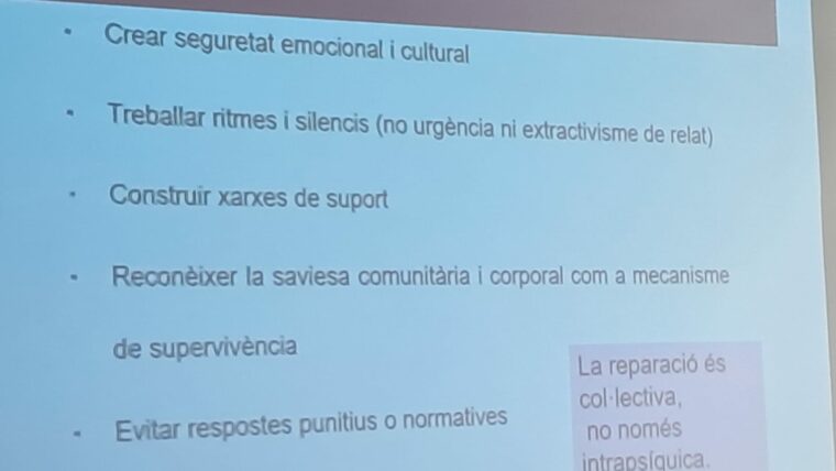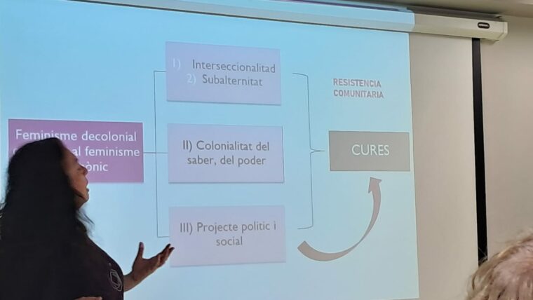 També es va treballar el marc de les epistemologies del Sud, enteses com a coneixements no hegemònics provinents de persones que habiten els marges. Es va reflexionar sobre com el racisme opera com a principi organitzador de les relacions de poder, i es van repassar conceptes de Fanon i Quijano, com la colonialitat del poder, del saber i del ser. A més, es van compartir aportacions del feminisme comunitari, com el concepte del bon viure, així com coneixements crítics sorgits de la subalternitat i de l’activisme polític.