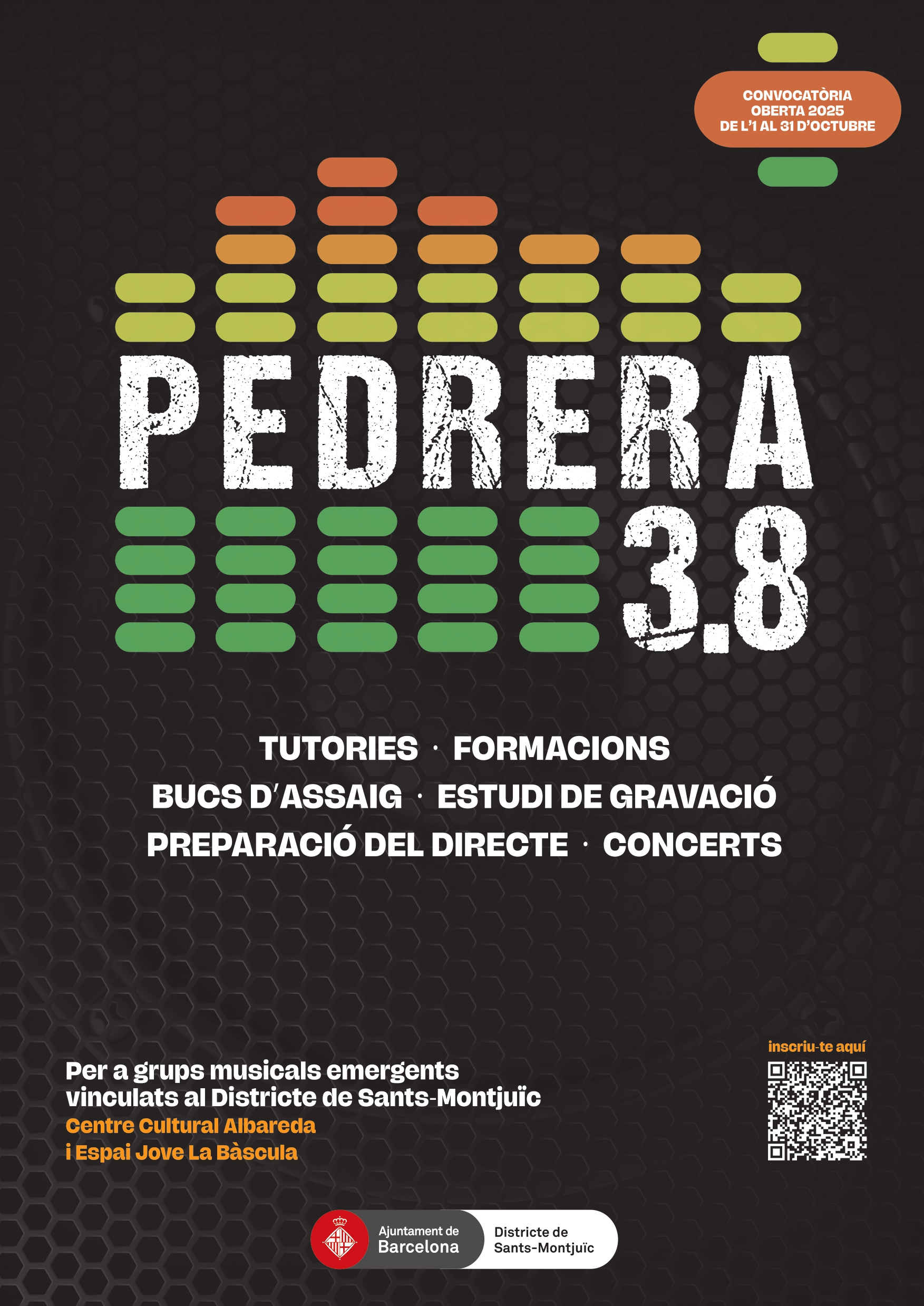 L'Espai Jove La Bàscula i el Centre Cultural Albareda, equipaments municipals amb especialització musical, obren la convocatòria per participar a la vuitena edició del Pedrera 3.8, programa d’acompanyament a grups musicals emergents vinculats al Districte de Sants-Montjuïc, format per joves de fins a 35 anys, que vulguin millorar i consolidar el seu projecte musical. En aquesta edició fins a tres grups rebran el suport del programa.