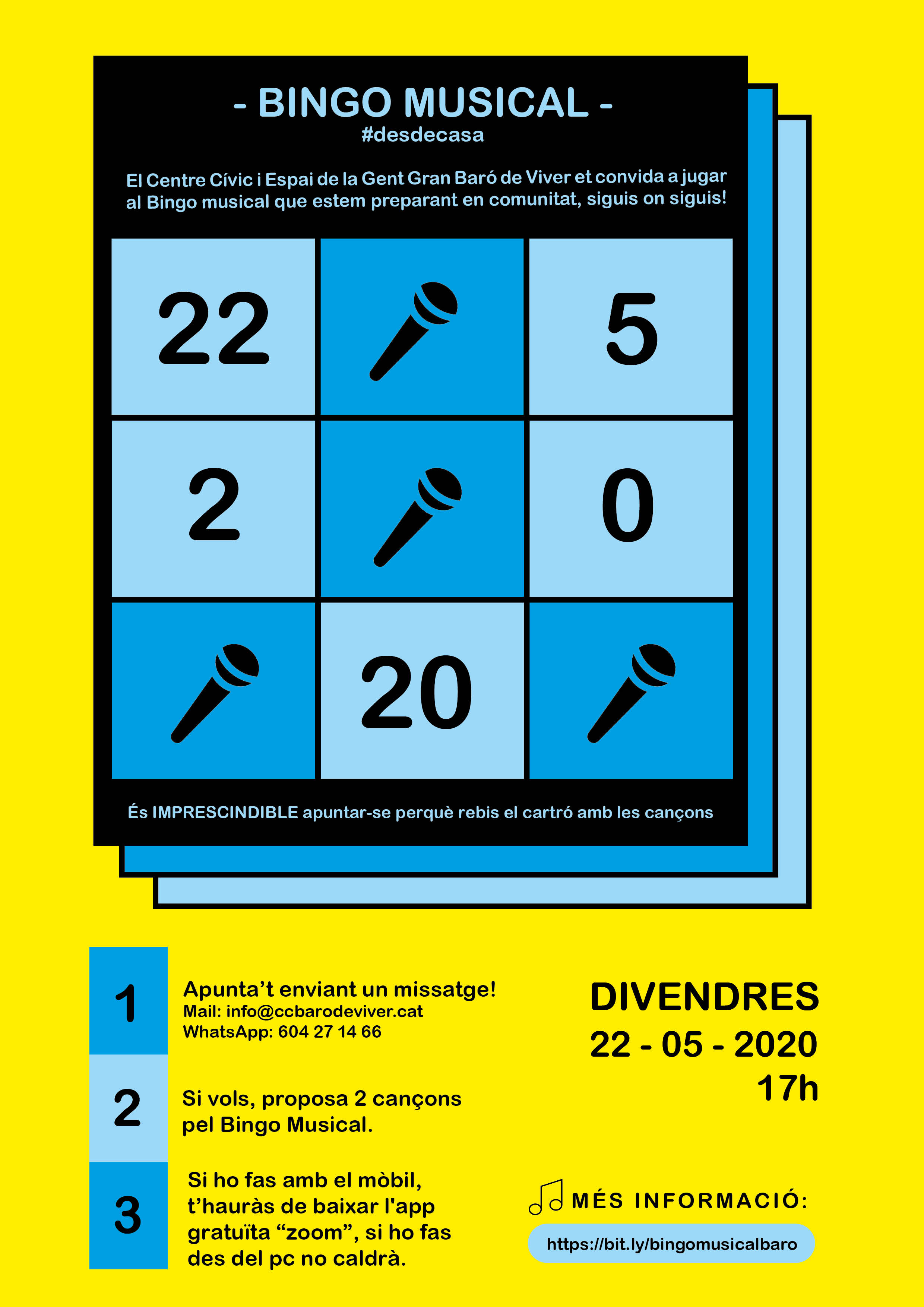 - Envia'ns un correu a info@ccbarodeviver.cat o un missatge de Whatsapp al 604 27 14 66 dient que vols participar en el BINGO MUSICAL, i si vols, pots proposar dues cançons perquè sonin.
