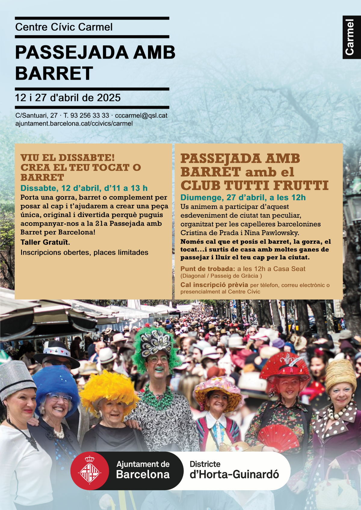 Esdeveniment organitzat per per les capelleres barcelonines Cristina de Prada i Nina Pawlowsky. Només cal que et posis el barret, la gorra, el tocat...i surtis de casa amb moltes ganes de passejar i lluir el teu cap per la ciutat. Des del centre cívic us animem a posar-vos un tocat divertit i singular i anirem totes juntes per gaudir d’aquest matí tan divertit!