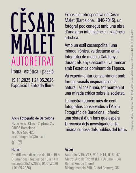 L’arxiu fotogràfic de Barcelona és un centre destinat a conservar, tractar, descriure i difondre el patrimoni fotogràfic de la ciutat, té conservades més de quatre milions de fotografies des de 1844 fins a l’actualitat. En aquesta visita coneixerem l’arxiu en profunditat i visitarem l’exposició temporal de Cèsar Malet.