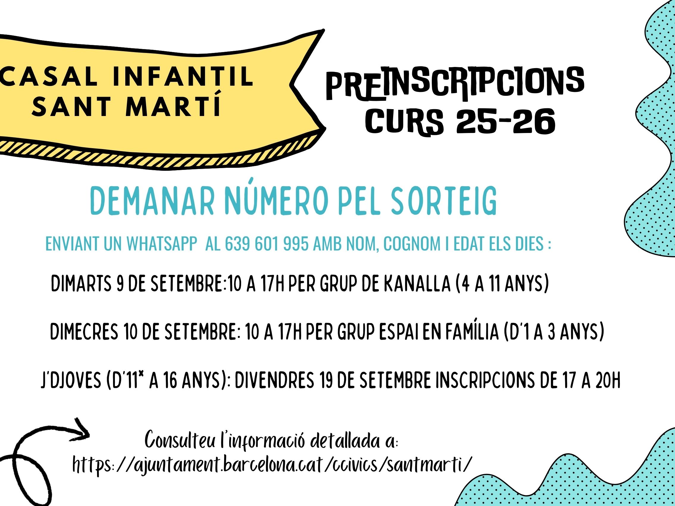 Dimarts, 9 de setembre de 10 h a 17 h: demanar número pel sorteig. Enviar nom, cognoms i dia que interessa. Un número per infant, independentment dels dies que vol.