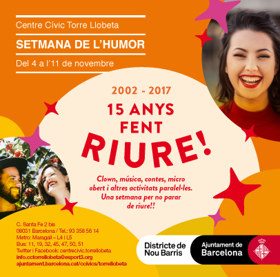 Qui ho diria, però ja fa cinc mil quatre-cents setanta-cinc dies que al Centre Cívic Torre Llobeta us fem riure amb una programació específica al voltant de l’humor, el CICLE SOM RIURE. Per celebrar-ho ens vestim de gal·la i capgirem el centre cívic per omplir-lo de rialles i colors amb una setmana plena d’activitats per no parar de riure!!