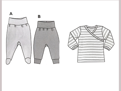 Cosirem un conjunt de dues peces per nadó desde la talla 50 cm (acabat de néixer) fins a la 92 cm. (aproximadament 2 anys). La part de dalt és una samarreta de màniga llarga creuada molt còmode de posar, pulida amb un ribet i per la part de baix cosirem un pantaló de punt duu puny a la cintura i als baixos perquè sigui més còmode i el puguin dur més temps (si vols el pots fer amb peus). És un bon projecte per agafar pràctica amb la costura de teixits elàstics, es pot cosir amb tela de samarreta o de dessuadora.