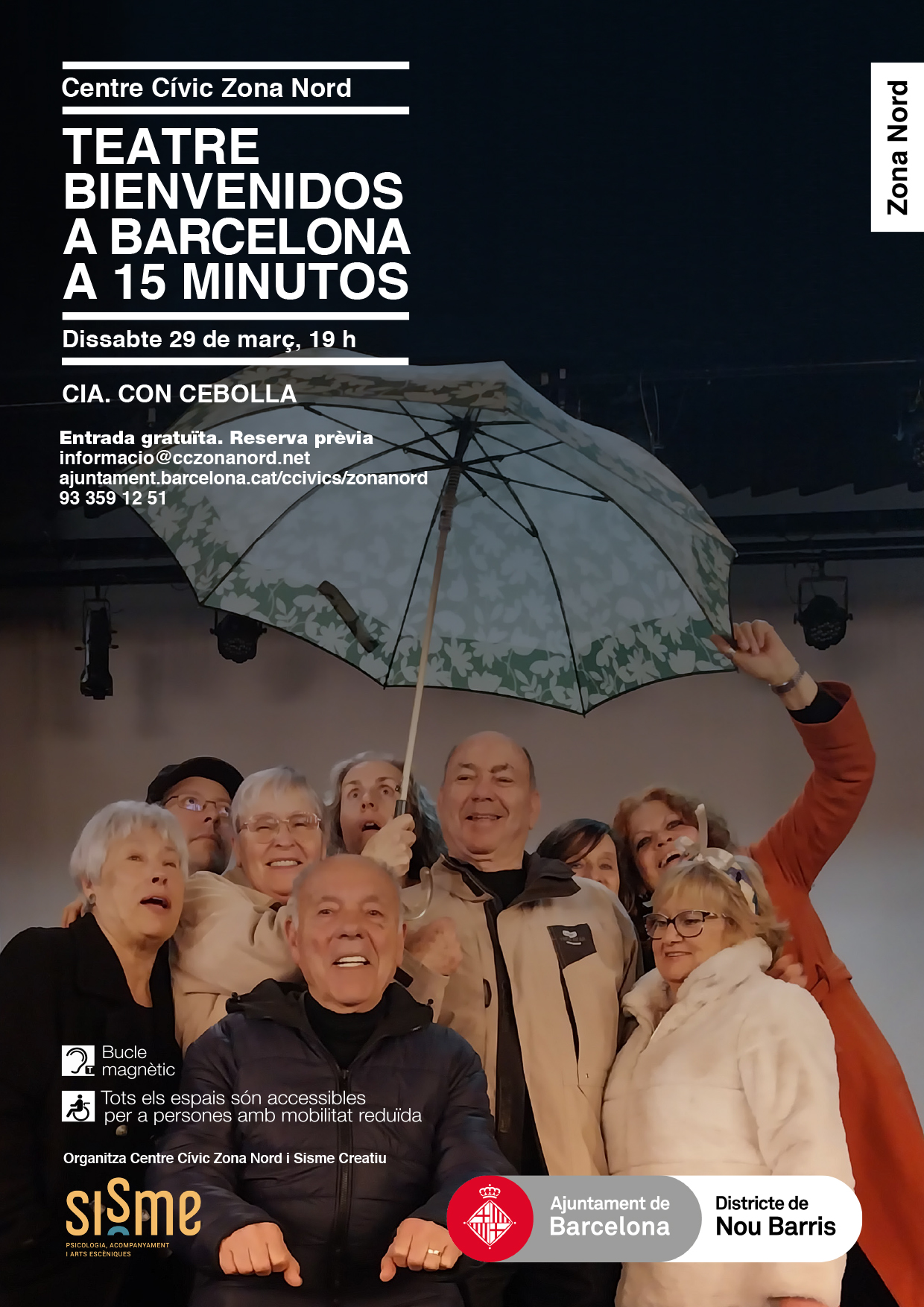 Benvinguts a Barcelona a 15 minuts és una obra de la companyia de teatre comunitari Con Cebolla que ens convida a recórrer les memòries i històries del barri que habitem. Una proposta que inclou la reivindicació, les rialles i la intimitat. Un viatge escènic que celebra allò que som i que ens recorda de què està fet el barri.