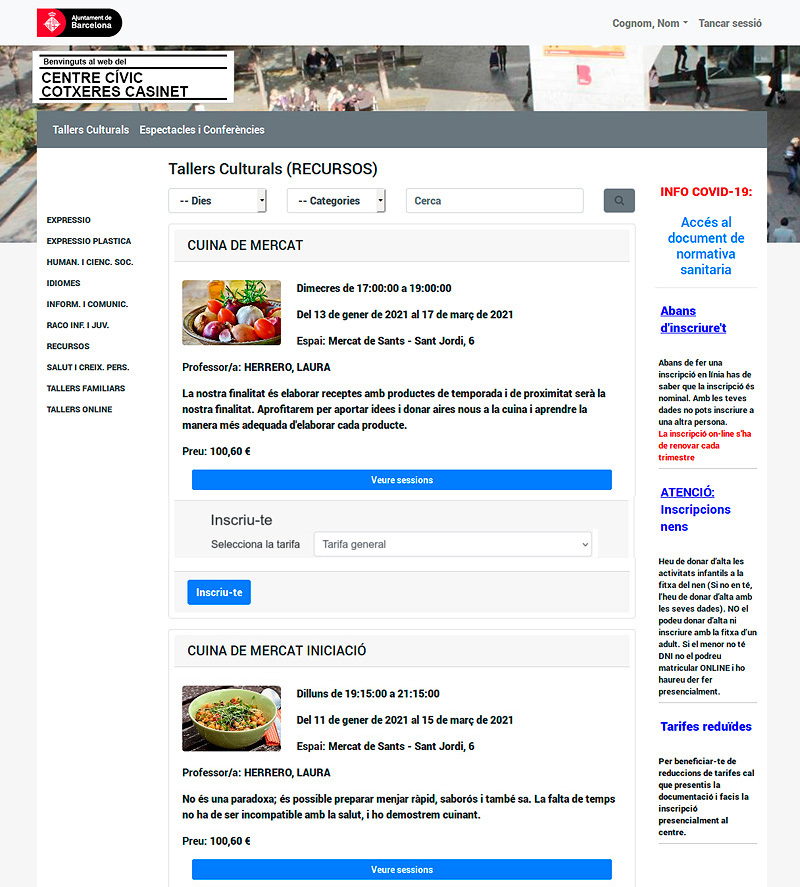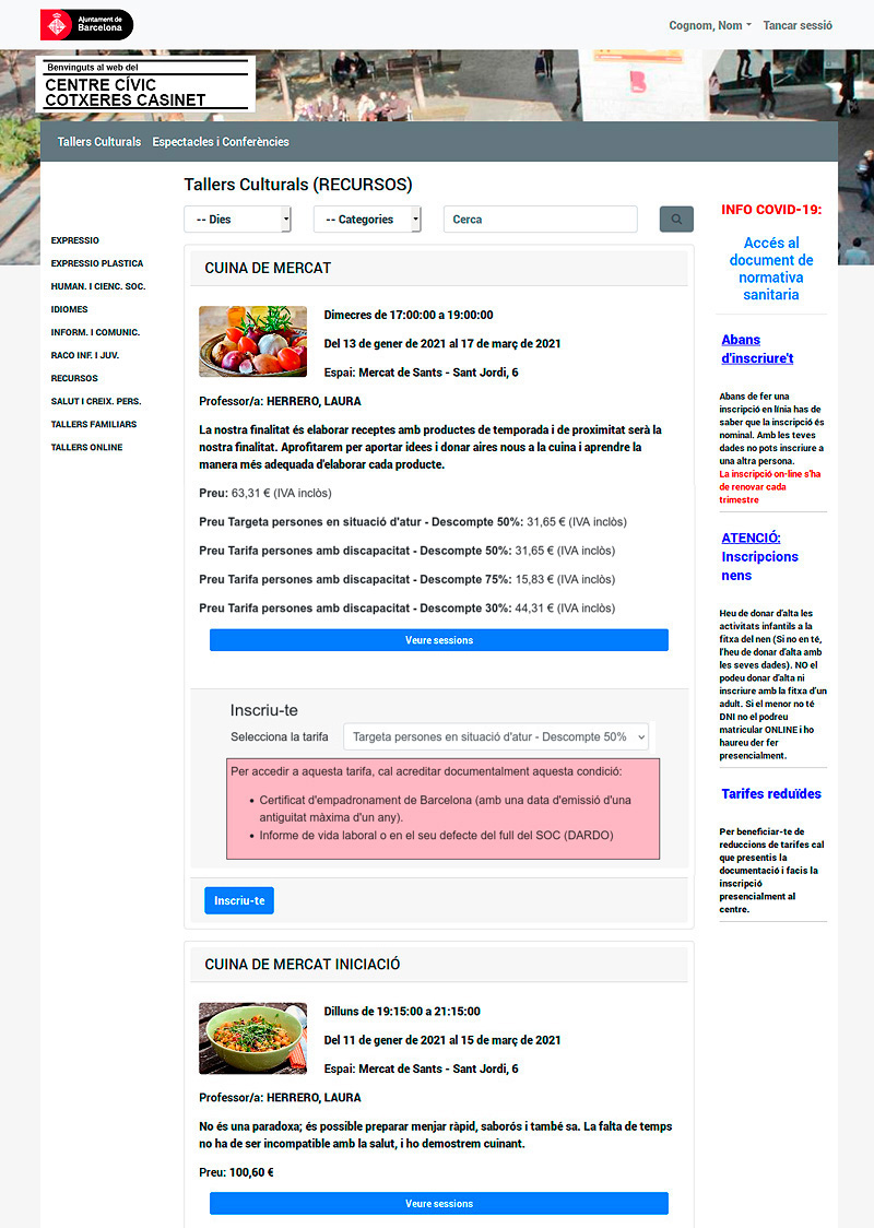 1. Seleccioneu el taller que us convingui. En aquest exemple, Cuina de mercat.