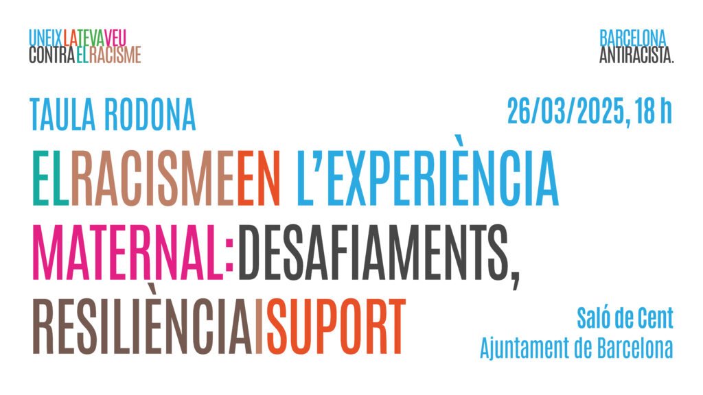 Amb motiu del Dia Internacional Contra el Racisme, l’Ajuntament de Barcelona organitza l’acte “El racisme en l’experiència maternal: desafiaments, resiliència i suport”. L’acte tindrà lloc el 26 de març a les 18 h al Saló de Cent de L’Ajuntament. L’assistència és gratuïta i cal que us hi inscriviu a dretshumans@bcn.cat