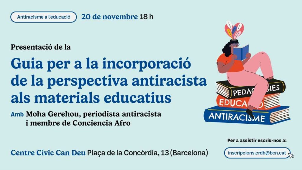 L’acte de presentació de la guia comptarà amb el Centre de Recursos en Drets Humans i l’Institut Diversitas, encarregats de redactar la guia. Es compartiran els objectius del document, així com alguns dels criteris que cal tenir en compte a l’hora d’incloure la perspectiva antiracista als recursos i materials educatius.
