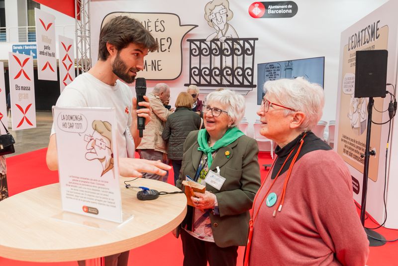 - Dues dones parlen amb un home a l’estand de l’Ajuntament de Barcelona dedicat a l’edatisme, al 26è Saló Fira Gran. Autora: Elena Pastor