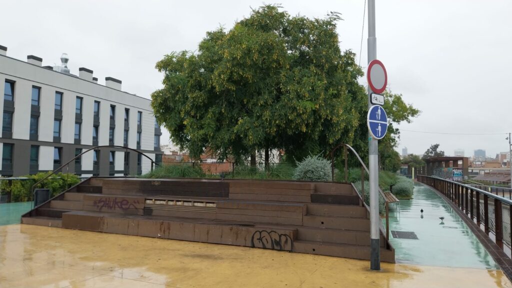 Els jardins de la Rambla de Sants estrenen un nou espai temporal destinat a la pràctica del patinatge impulsat com a projecte pilot de promoció de la convivència i l’urbanisme actiu per les entitats Snt4Ever i Reviu.Barcelona amb el suport de l’Ajuntament de Barcelona.