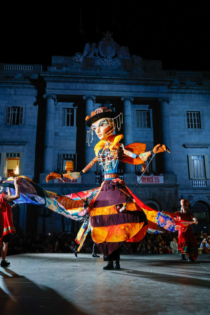The beast and the giant inspired by the bee, a symbol of Manchester and created especially for La Mercè, were present at key moments in fifty traditional culture activities such as the starting ceremony (Toc d’Inici), the beasts’ stroll (Passejada de Bèsties), the entourage (Seguici) and the procession (Cavalcada), which followed a new route starting in Pl. Catalunya. The festivities also celebrated the 75th anniversary of the Obra del Ballet Popular with a meeting of traditional dance groups from all over Catalonia, and the 75th anniversary of the Sports Sardana Competition.