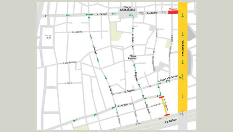 El desvío de tráfico para acceder en la plaza de Sant Jaume, por lo tanto, será por la Via Laietana, las calles de Àngel J. Baixeras, de la Fusteria, Ample, del Regomir, Ciutat y hasta la plaza de Sant Jaume. Los itinerarios de salida de la plaza serán por las calles de Ferran, de Avinyó y Ample.
