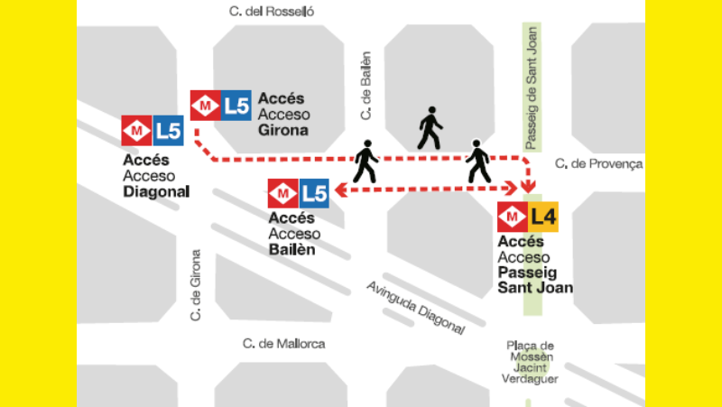 El intercambio entre líneas se tendrá que hacer desde paseo de Sant Joan —si el intercambio se hace desde la L4— y por la calle de Provença hasta la bocana de la L5 situada en el cruce con la calle de Bailèn, o de forma inversa si el origen es la L5. Tanto en las salidas desde la L4 y la L5 como a pie de calle, los itinerarios del enlace estarán debidamente señalizados y no será descontado ningún viaje al volver a validar.