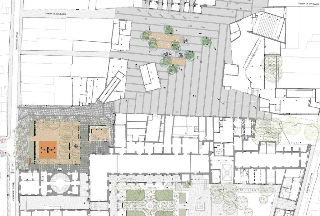 Esta intervención se encuentra enmarcada en el proyecto de reforma del Antiguo Hospital de la Santa Creu, que busca la transformación de todo el entorno para crear un nuevo gran espacio de encuentro en el Raval, con mejores conexiones a través de los Jardines de Rubió y Lluch y la futura rehabilitación del recinto con nuevos y mejores equipamientos públicos culturales.