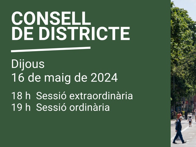 El Consell Plenari del Districte convoca dues sessions: una extraordinària a les 18 hores i l'altra ordinària a les 19 hores. Es faran a la sala de plens de la seu del Districte i també es retransmetran en directe.