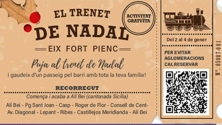 Gaudeix d’un passeig màgic amb el Trenet de Nadal i descobreix els punts més emblemàtics del barri amb tota la família. És imprescindible reservar plaça amb antelació a partir de l’11 de desembre a través del següent enllaç: Inscripcions al trenet de Nadal de l’Eix Fort Pienc.