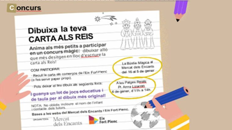 Aquest desembre, els infants poden participar d’un concurs molt especial: enlloc d’escriure la carta als Reis Mags hauran de dibuixar allò que més desitgen. Per participar-hi, es pot fer servir de base la carta que reparteixen els comerços de l’Eix Fort Pienc o també paper propi, posar-hi el nom de l’infant i el contacte dels tutors, i dipositar-la als punts habilitats. La carta amb els dibuixos més originals guanyarà un lot de regals de jocs educatius i de taula.
